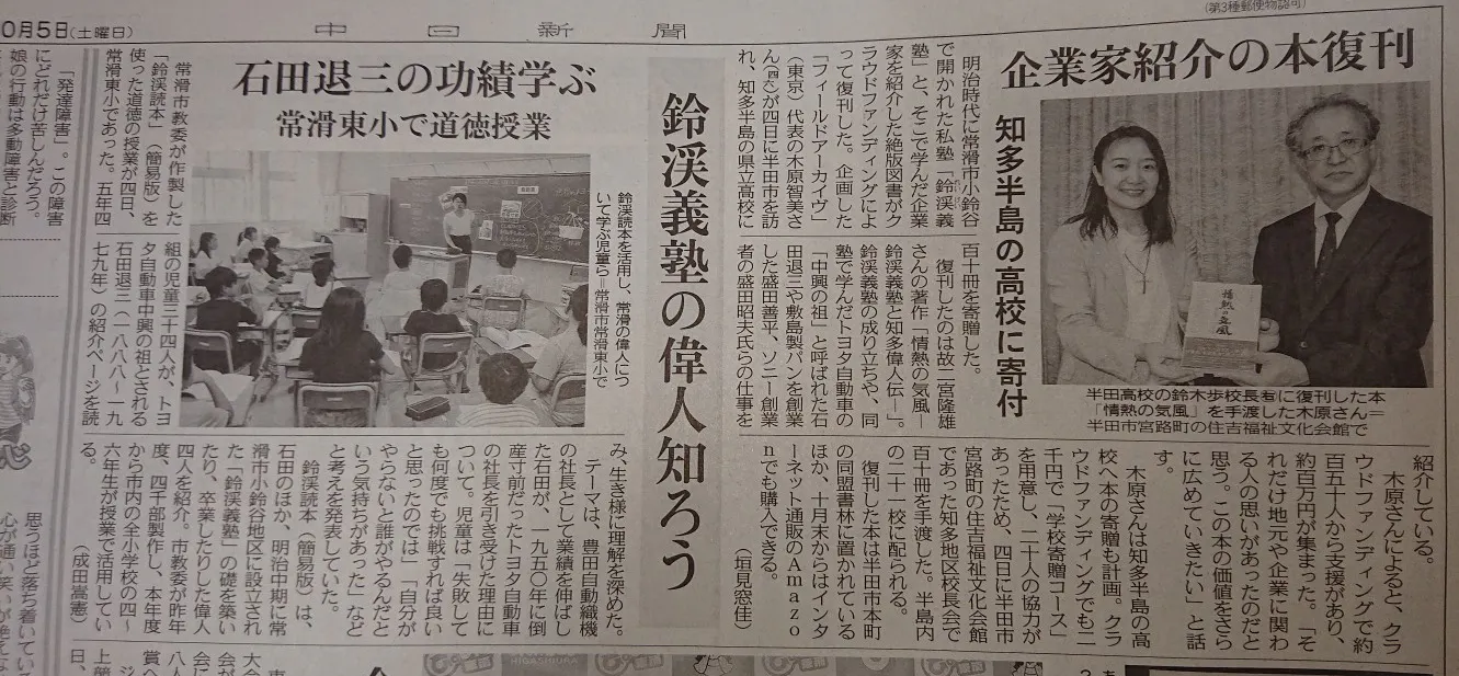 2019年10月5日(土) 中日新聞 知多版にて『情熱の気風』復刊プロジェクトの記事が掲載されました。