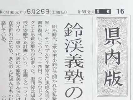 2019年5月25日(土) 中日新聞 愛知県内版にて『情熱の気風』復刊プロジェクトの記事が掲載されました。