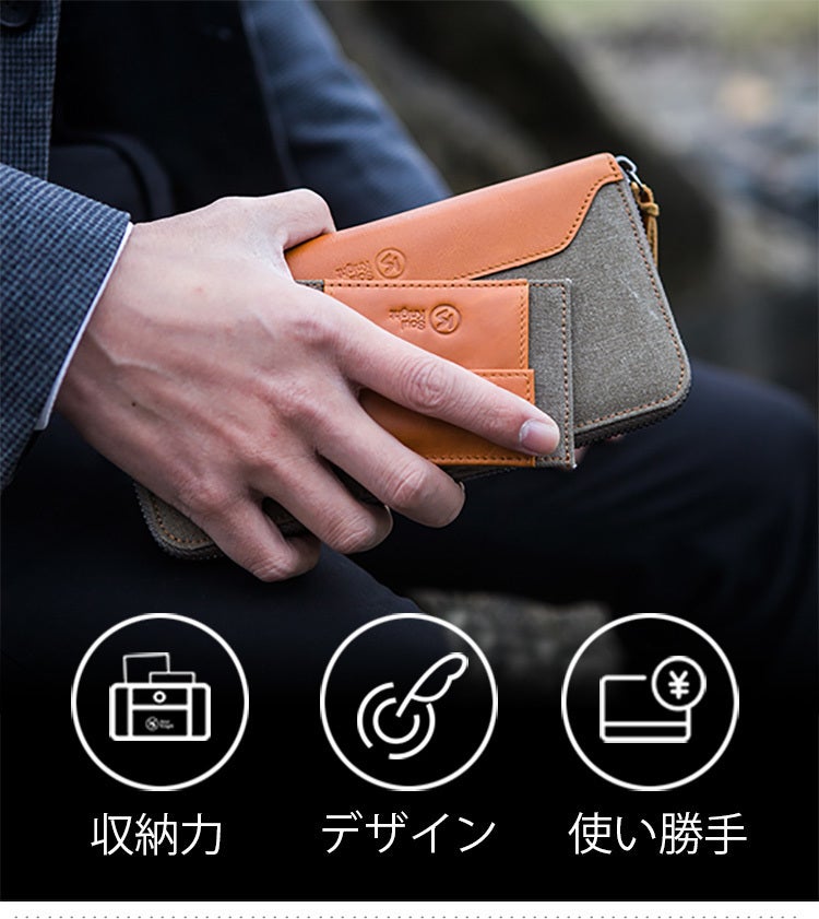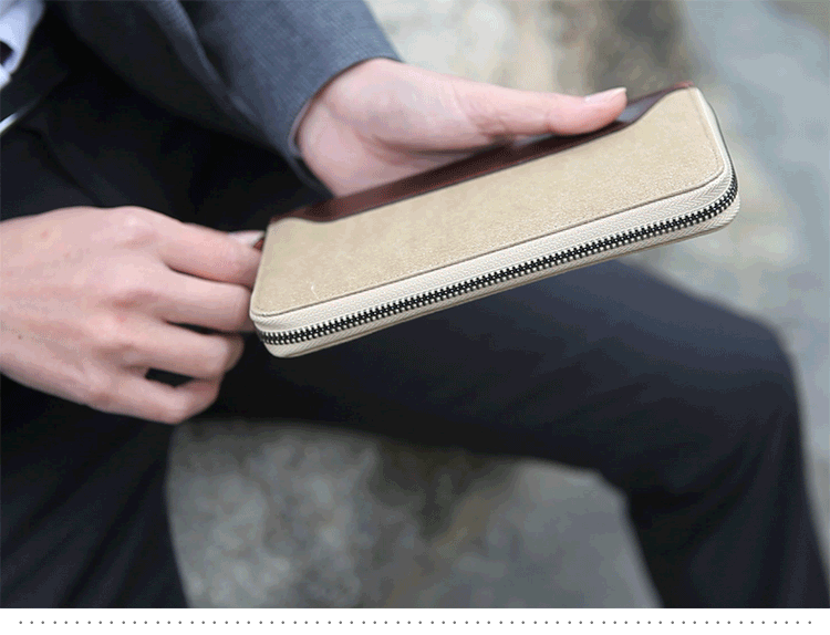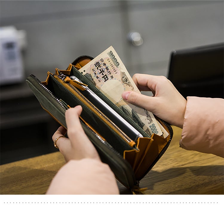 コの字型のファスナータイプで、どこに何があるかを瞬時に把握できます。レジの前で、お札がスムーズに取り出せますし、ポイントカードやクレジットカードを探したり、慌てて小銭を落としてしまったりすることがありません。