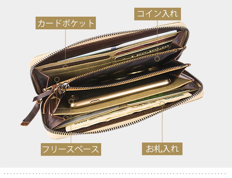 お札、小銭、カード入れのほか、フリースペースもたっぷりととった構造は非常に大容量です。