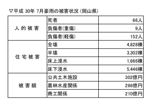 2018年7月7日に 住 宅 被 害 全壊 4,828棟、死者 66人 平成最悪の水害となった岡山県。 倉敷市真備の小田川が氾濫し、私達の馴染みのある町が水没してしまった事で、今までに経験のないショックを受けました。