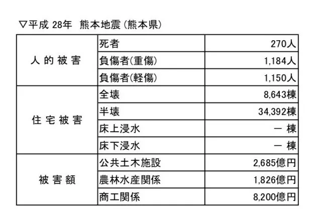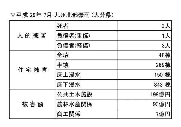 (注) 「平成 30 年 7 月豪雨」(岡山県)の人的被害・住宅被害は 2019 年 1 月 4 日、公共土木施設被害 額は 2018 年 8 月 29 日、農林水産関係被害額は 2018 年 11 月 15 日、商工関係被害額は 2018 年 8 月 29 日時点。「平成 28 年熊本地震」(熊本県)の人的被害・住宅被害は 2019 年 1 月 11 日、公共 土木施設被害額・商工関係被害額は 2016 年 9 月 14 日、農林水産関係被害額は 2018 年 3 月 13 日時点。「平成 29 年 7 月九州北部豪雨」(大分県)の人的被害・住宅被害は 2017 年 8 月 31 日、 公共土木施設被害額・農林水産関係被害額・商工関係被害額は 2017 年 8 月 22 日時点。