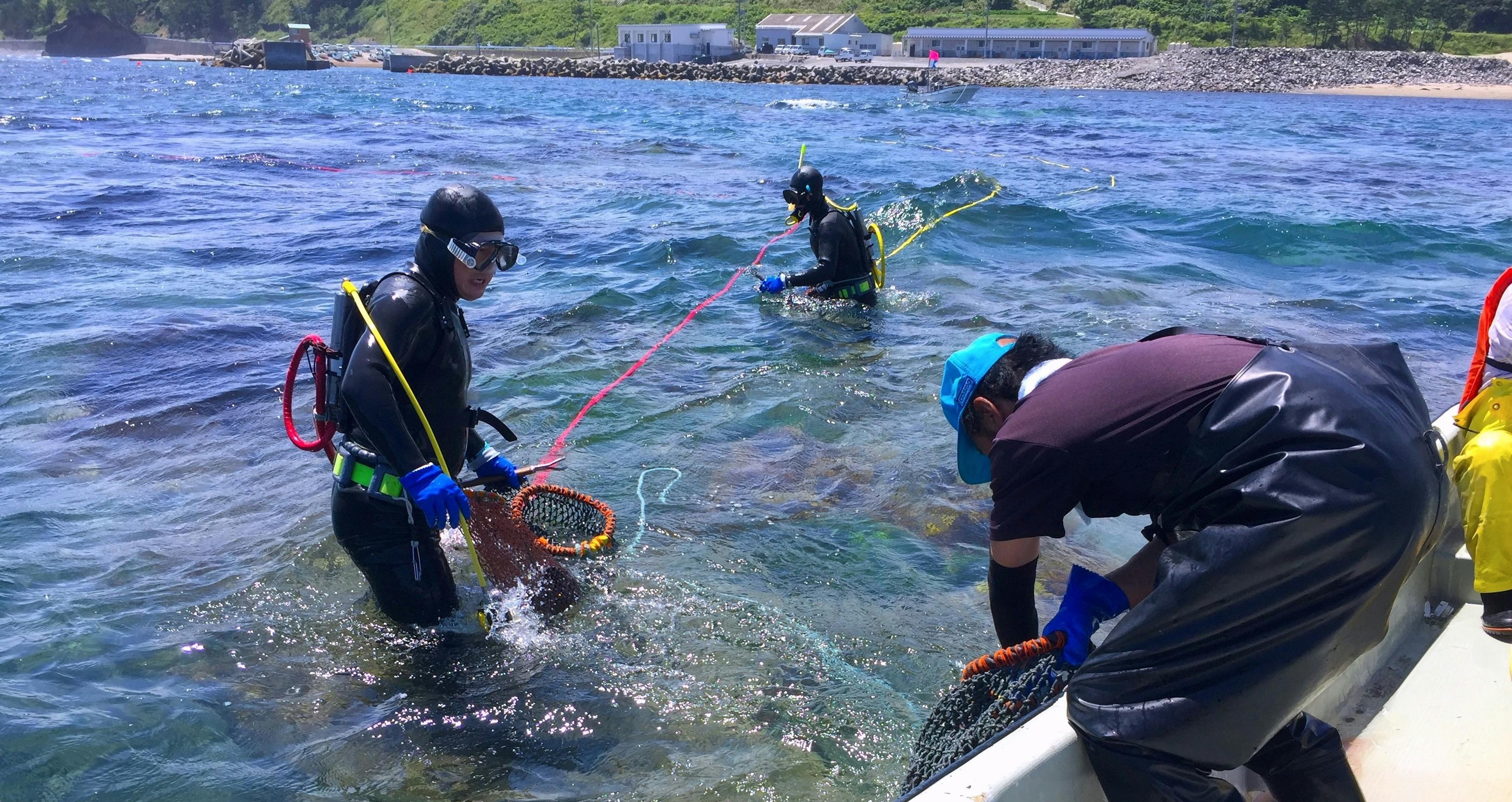 2017年から研究者チーム(後述)と協議を重ね、また地元漁協の方々とも調整しながら、昨年から洋野町内で試験に着手。試行錯誤を繰り返し、まだバラつきはあるものの、うにの身入りは改善してきており、うに生産地の洋野町の人が食べてもおいしいと評価されるレベルまで達しています。