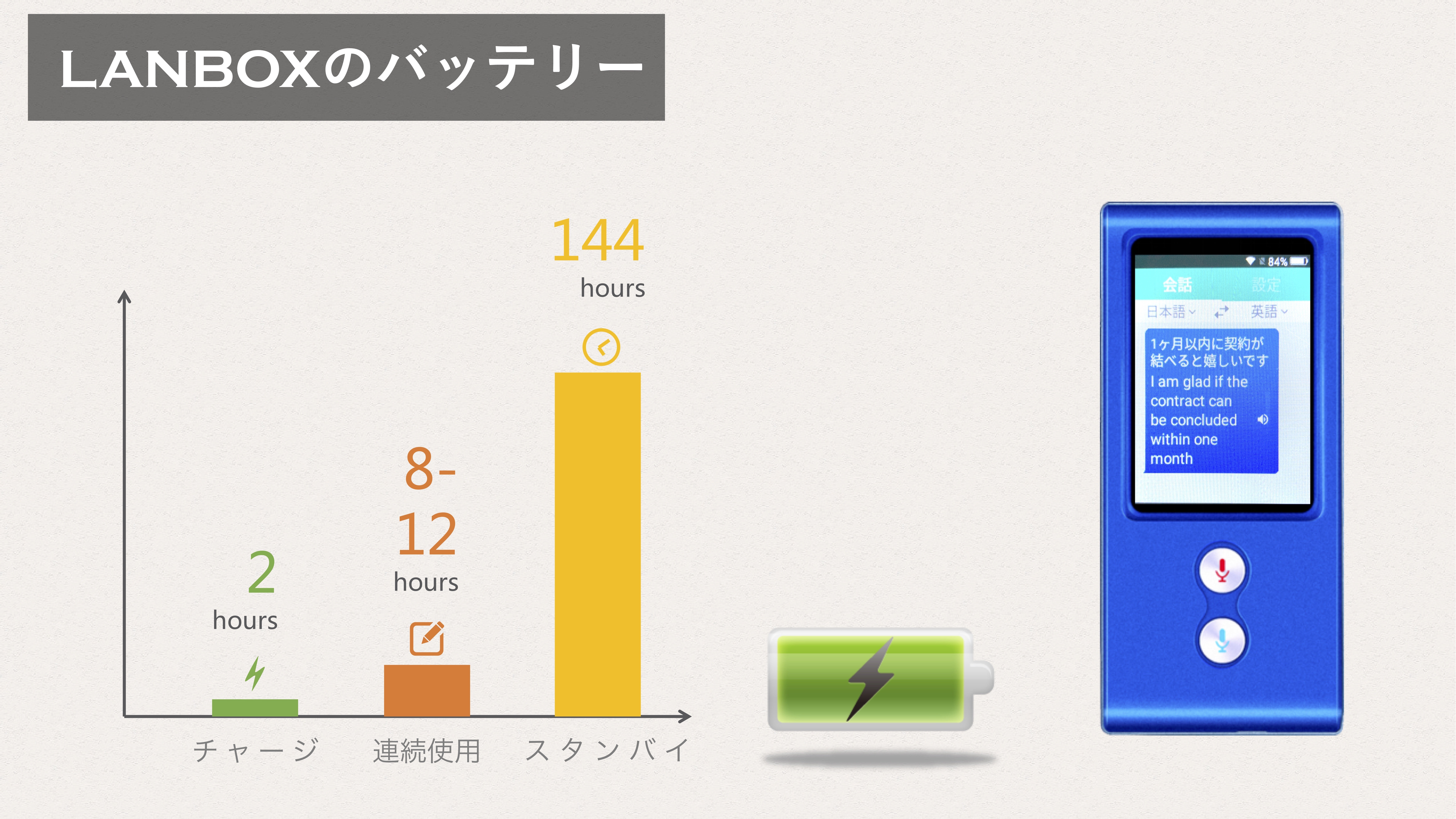 ④スマホを連続使用すると平均的には4〜6時間ほどが一般的ですが、「LANBOX」は8〜12時間の連続使用が可能です。大切な会話の途中でバッテリーが切れてしまうという事態を回避できます。