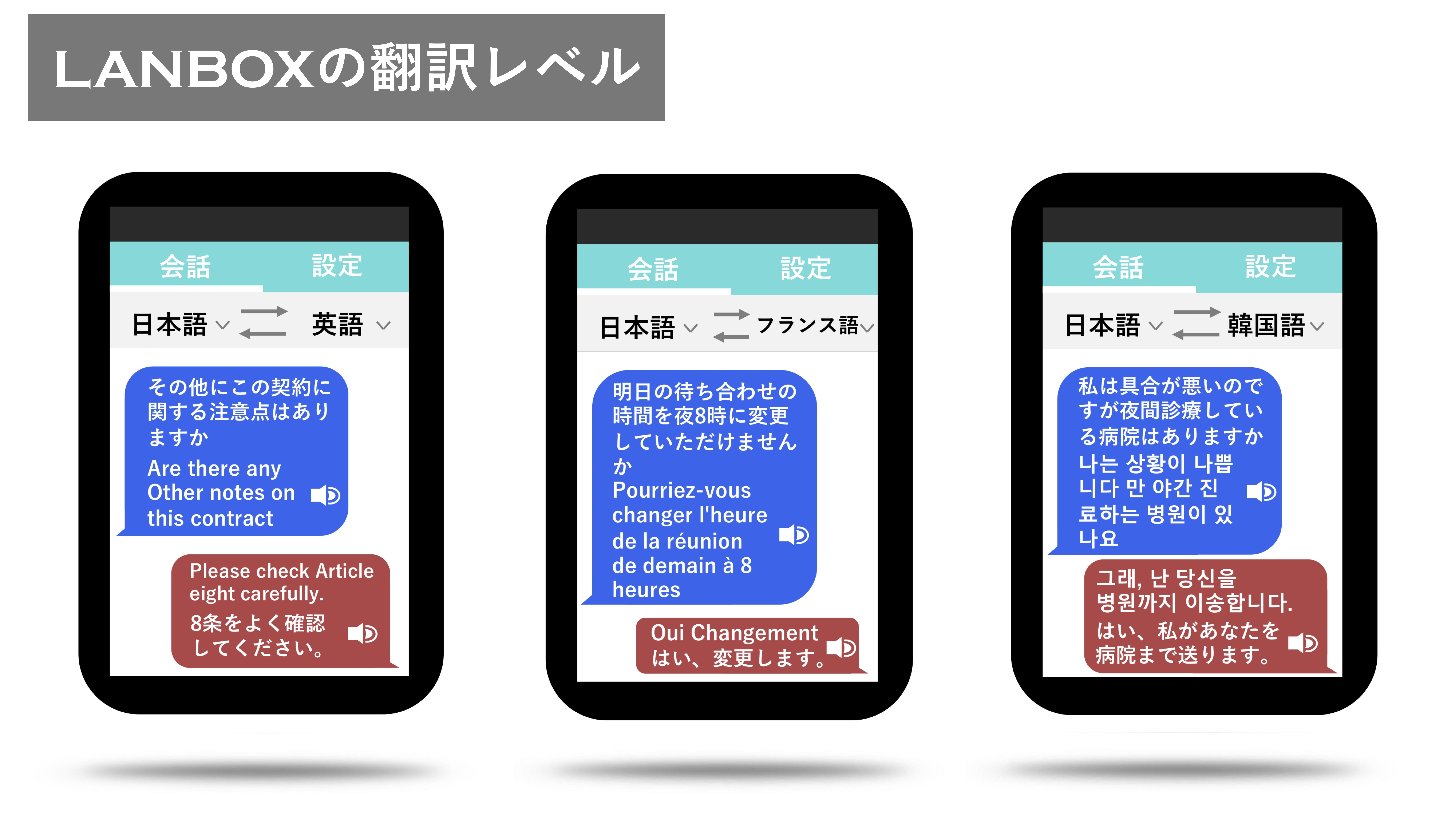 外国語が話せる方でも、実際に海外に行くとなかなか通じないことが多いと言われています。外国語に不安がある方は、「LANBOX」が有ると無いでは大きな差があります。旅行でも出張でも、せっかくの海外を充実した時間にする為には、伝わる会話が最も重要です。