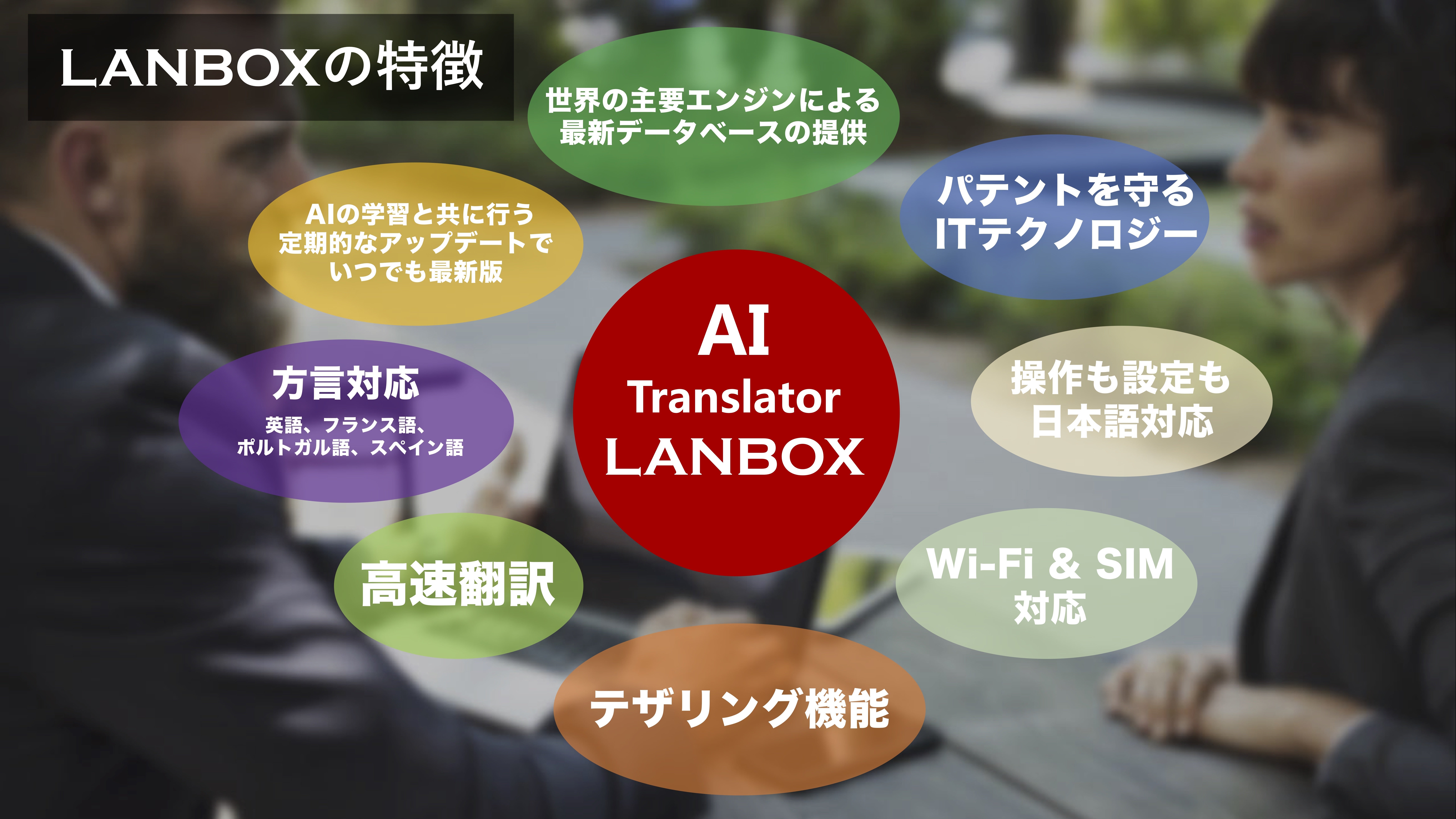 「LANBOX」は、AIが学習したフレッシュな情報が常にインプットされているため、日常会話だけでなく、ビジネスシーンや緊急時にも役立ちます。従来の翻訳機には難しいとされていた高度な会話も、AIトランスレーターが手伝ってくれます。