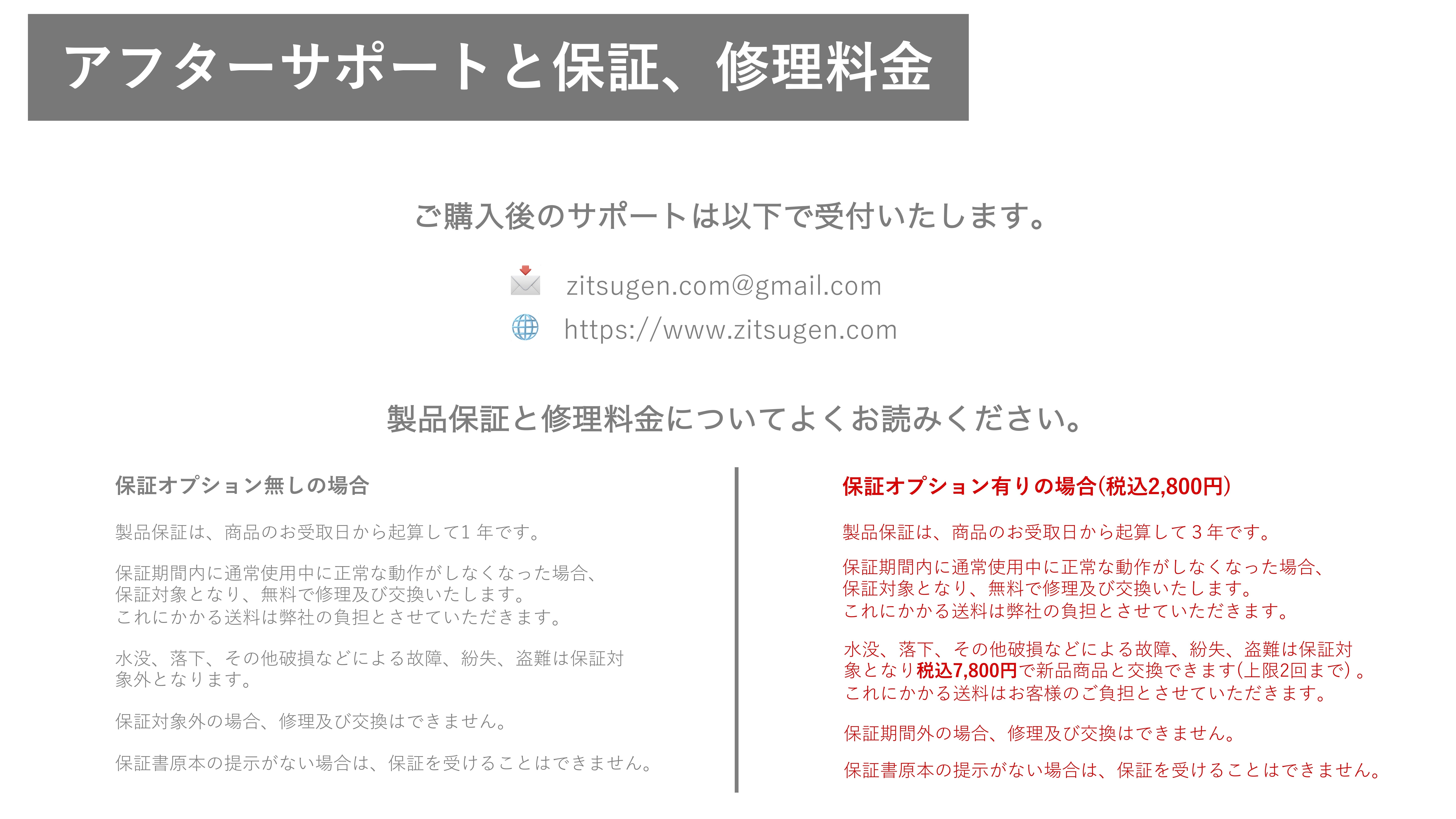 商品には万全を期しておりますが、万が一、不具合や故障が起こった場合、お客様に対して迅速な対応を撮らせていただくため事前に保証範囲や料金、その他ルールを定めさせていただきます。