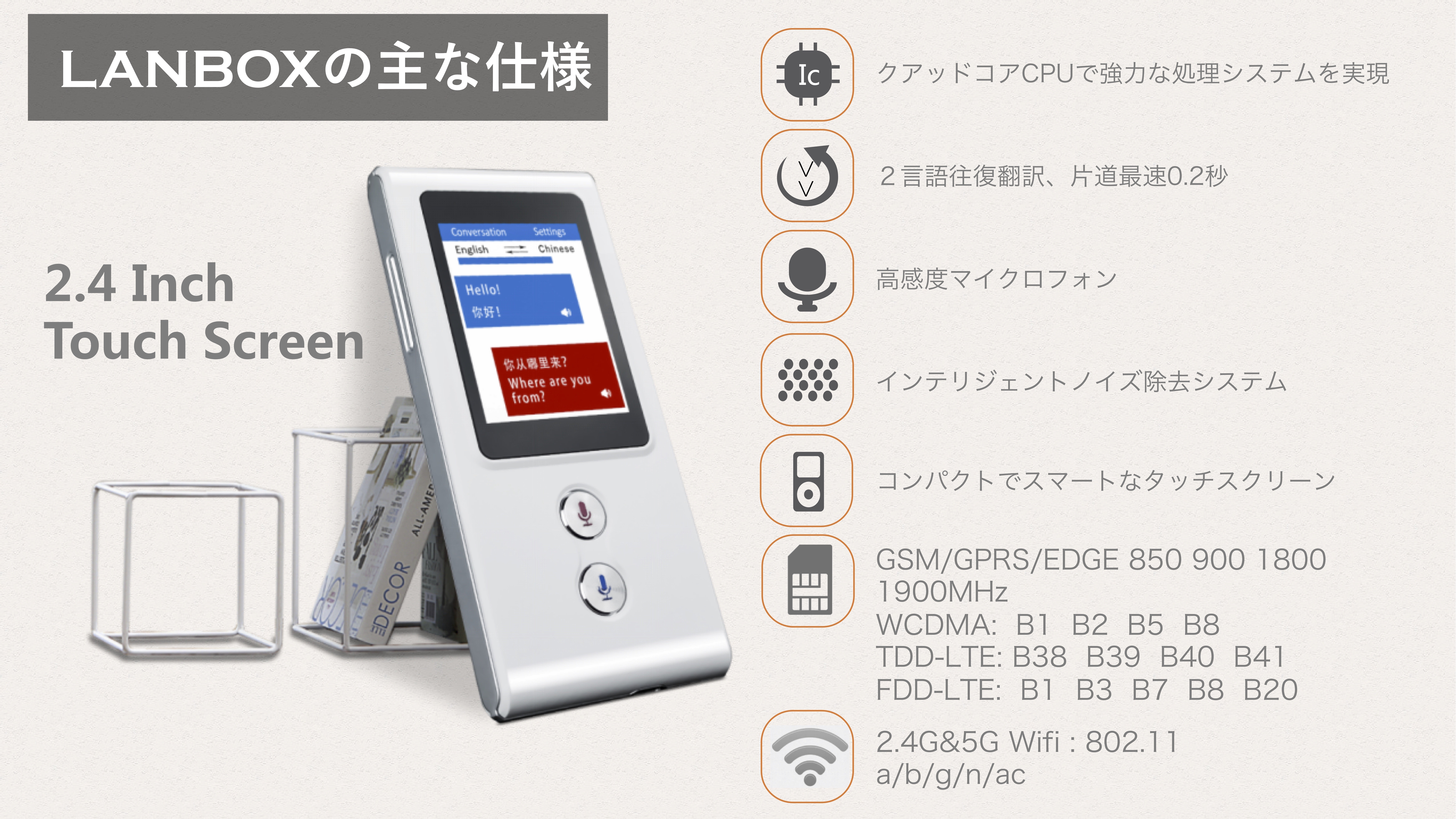 「LANBOX」は、あらゆる環境やあらゆる場所で高性能な翻訳パフォーマンスを発揮します。インターネット環境さえ整えば、世界のどこにいても快適なトランスレーティングを味わうことができます。マイクロSIMカードを使用している場合は、テザリング機能によりWiFiルーターとして他のデバイスにインターネット環境を提供できます。また、マイクは特に高度な設計を施しており、ショッピングモールでもナイトクラブでも正確に音声をキャッチします。