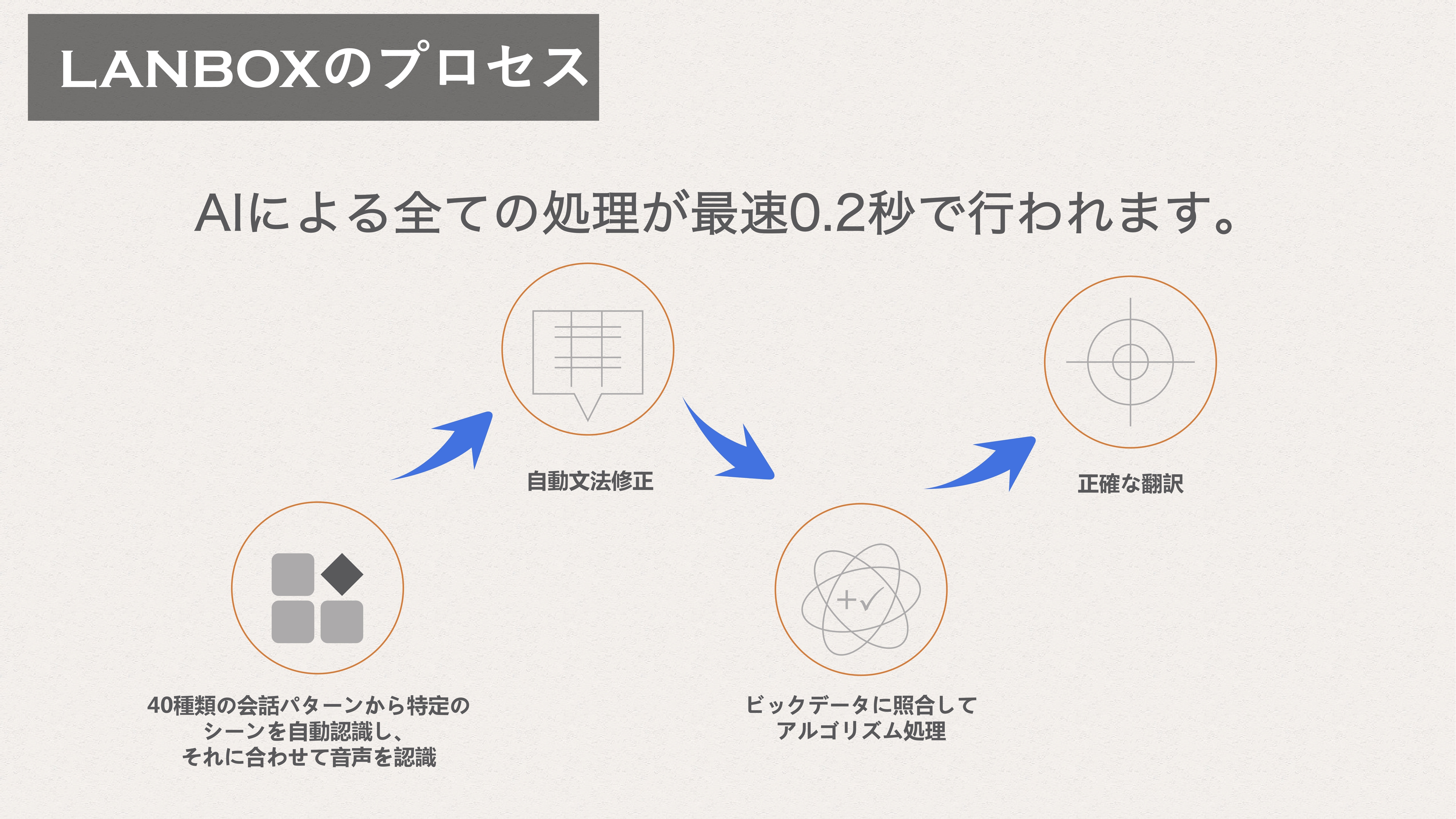 「LANBOX」の翻訳プロセスは、まずはじめに、会話のシーンを自動認識します。ビジネス、旅行、友人との会話、屋外、屋内、、、様々なビックデータを元に現在のシーンを自動認識します。さらに自動文法修正を行います。これらをアルゴリズムに照合し、正確な翻訳へと導きます。最速0.2秒の高速翻訳です。従来の製品では翻訳に1秒以上かかってしまうことも多々ありましたが、こういうストレスはもうありません。