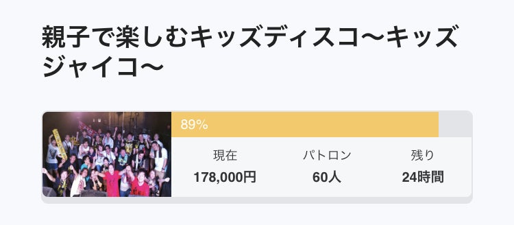2019/04/24 02:30残りあと1日もうクラウドファンディングも終わってしまいます!本当に本当にここまで応援して頂いてありがとうございます!感謝!感謝です!まだ目標金額は達成していません。ラスト1日まで達成出来ずめちゃめちゃ悔しいです!こんなにたくさんの方に応援して頂いているのに!悔しくて悔しくて!でも最後の最後まで諦めません!今まで応援して頂いた方がたくさんいるから!子どもたちと音楽で踊る楽しさを群馬で大好きなライブハウスやる高崎フリーズで!育児でなかなかライブハウスに来れないパパママも来れるといいなとストレス発散になってくれたら嬉しいなと!子どもも大人もみんな一緒に音楽に合わせて踊りたい!ラストスパート!最後まで諦めず行きます!頑張ります! もっと見る