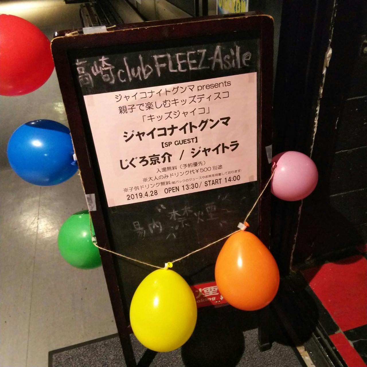 2019/04/30 01:474/28親子で楽しむキッズディスコ~キッズジャイコ~イベント開催し、無事に終えたことをご報告いたします。子ども7名、大人8名の方にご参加して頂きました。キッズジャイコスタッフ権利で2名の方にお手伝いして頂きました。選曲権利でREADY STEADY GO/L'Arc~en~Ciel、令和/ゴールデンボンバー、反抗声明/あゆみくりかまき、令和/ゴールデンボンバーの4曲を流させて頂きました。装飾を入り口から会場内まで可愛く、子どもが喜ぶ雰囲気作りが出来たと思います。ジュースやお菓子もいっぱい用意することも出来ました。最後には子ども一人一人に表彰状を渡すことも出来ました。イベントは子どもも大人も思いっきり笑顔で踊って楽しんでいたと思います。照明も明るくして音量にも配慮したりパパママにも聞きながら子どもたちにあった環境が作れていたと思います。泣いたり、グズったりする子どももいなかったことが子どもたちにとってつまらなかったり、嫌だったり、帰りたいと思わない環境だったのかと思います。子どもも大人も楽しめたと言ってもらえたりまたやってと次回のイベントを期待する声も聞かれました。参加人数は少なく、思った集客が出来なかったことが悔やまれますが今後もキッズジャイコを続けていき多くの方に周知して頂きそして多くの方に参加していただけるイベントを作っていきたいと思います。そしてそして今回のイベントに関わって頂いた多くの方に感謝御礼申し上げます。ご支援して頂いた方や出演してくれた方、お手伝いしてくれた方、遊びに来てくれた方、会場のスタッフの方、応援してくれてる方、家族、友人、仲間本当に本当にありがとうございます。たくさんの方の想いが詰まったイベントが出来たこと感謝します。この応援を胸に刻み、今後の活動の糧にもしていきます。最高の雰囲気の最高のイベントにすることが出来ました。本当に本当にありがとうございました。キッズジャイコとてもとても好評だったので、また必ずやります!もっともっとたくさんの方に来て頂けるように頑張っていきます!ジャイコナイトグンマ猿まさる《4/28キッズジャイコセットリスト》スリル/布袋寅泰にんじゃりばんばん/きゃりーぱみゅぱみゅREADY STEADY GO/L'Arc~en~Cielきのこたけのこ戦争/打首獄門同好会恋のスペルマ/マキシマム ザ ホルモンココ☆ナツ/ももいろクローバー反抗声明/あゆみくりかまきMEGA SHAKE IT!/キュウソネコカミ令和/ゴールデンボンバーパプリカ/Foorin もっと見る