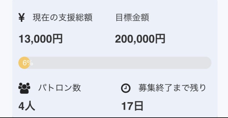 21名の方に支援して頂きました!そしてもう少しで折り返しの所まで来ています!現在9万円!多くの方に支援して頂き、本当に感謝しています!SNSでの拡散もして下さる方も多く応援されている支えられている助けてもらっている背中を押してもらえていると凄く感じています!まだまだ序盤です!ここからだんだんと苦しくなってくると思っています!発信を止めず多くの方に知ってもらえるように多くの方に応援しても良いと思ってもらえるように今後も頑張っていきたいと思います!次の目標は折り返しの10万円を目指します!そしてもっともっと多くの方に応援してもらうことを目標としてやっていきますので、よろしくお願いします!