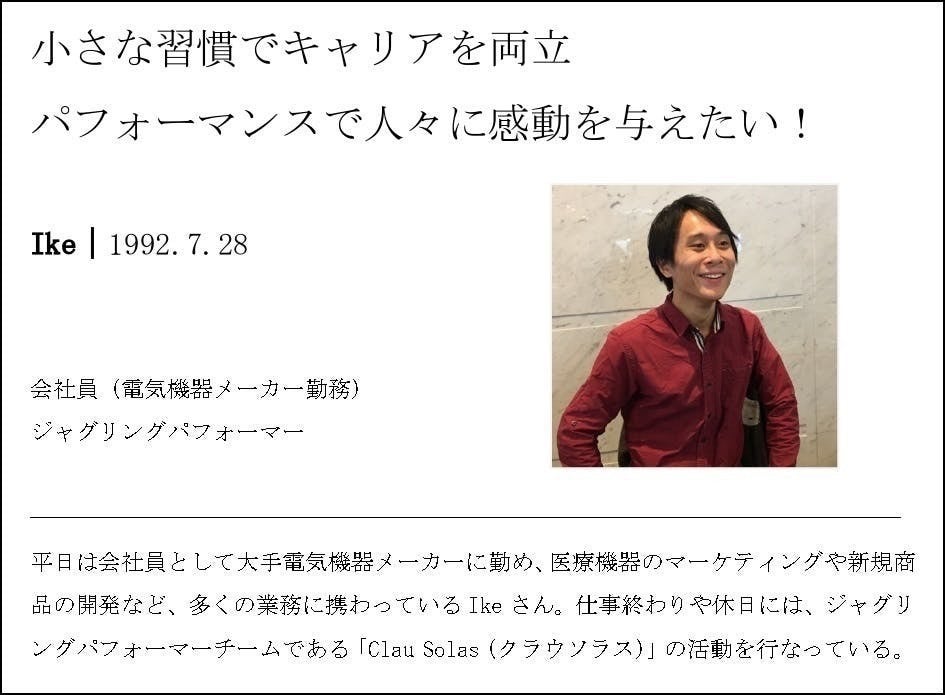 会社員とジャグリングパフォーマーという掛け合わせだからこそ、大切にしていることもあるという。
