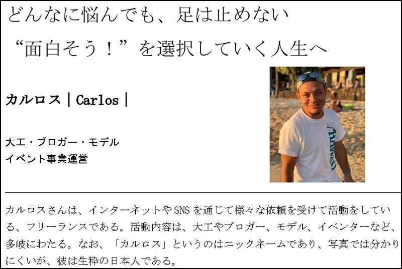 大工やブロガーなど、フリーランスとして様々な活動をしているカルロスさん。