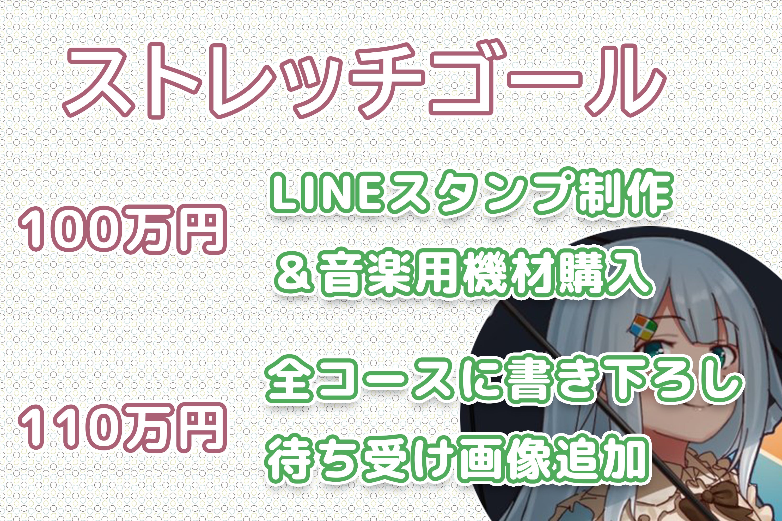 100万円達成➡「~公式LINEスタンプの作成 24個タイプ~(あらと安里先生にラインスタンプ用のイラストを書いていただきます!)」&「音楽活動のための機材購入(既存PCスペックの向上や作業効率向上)」