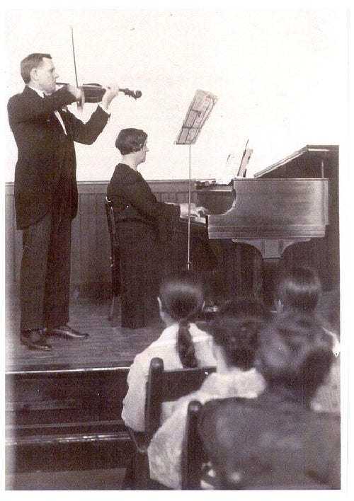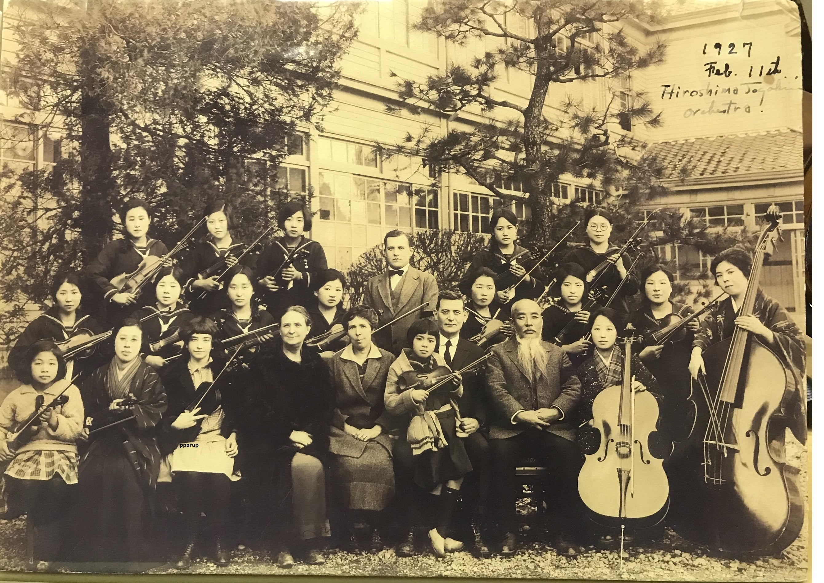 生徒の前で演奏するパルチコフさん彼の演奏の評判を聞いた私立広島女学校(1932年に広島女学院と改称)のゲーンズ校長は、彼を音楽教師として採用。彼は1926年~1943年音楽教師を務め、30人程度の弦楽オーケストラを組織。女学生だけのオーケストラは当時大変珍しく、広島の名物となりNHKのラジオで放送されるほどになりました。