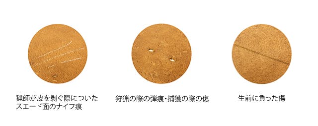 ジビエ革は生前に負った傷や、狩猟の際の弾痕、捕獲の際の傷、猟師が皮を剥ぐ際についたスエード面のナイフ痕などがあります。革本来の風合いを残すため、あえてそのまま仕上げており、製品にもデザインとして取り入れています。既存の既製品であれば不良とされるそれらの傷にさえも、生きてきた証のストーリーがあります。それらに思いをはせてみるのも良いのではないでしょうか。