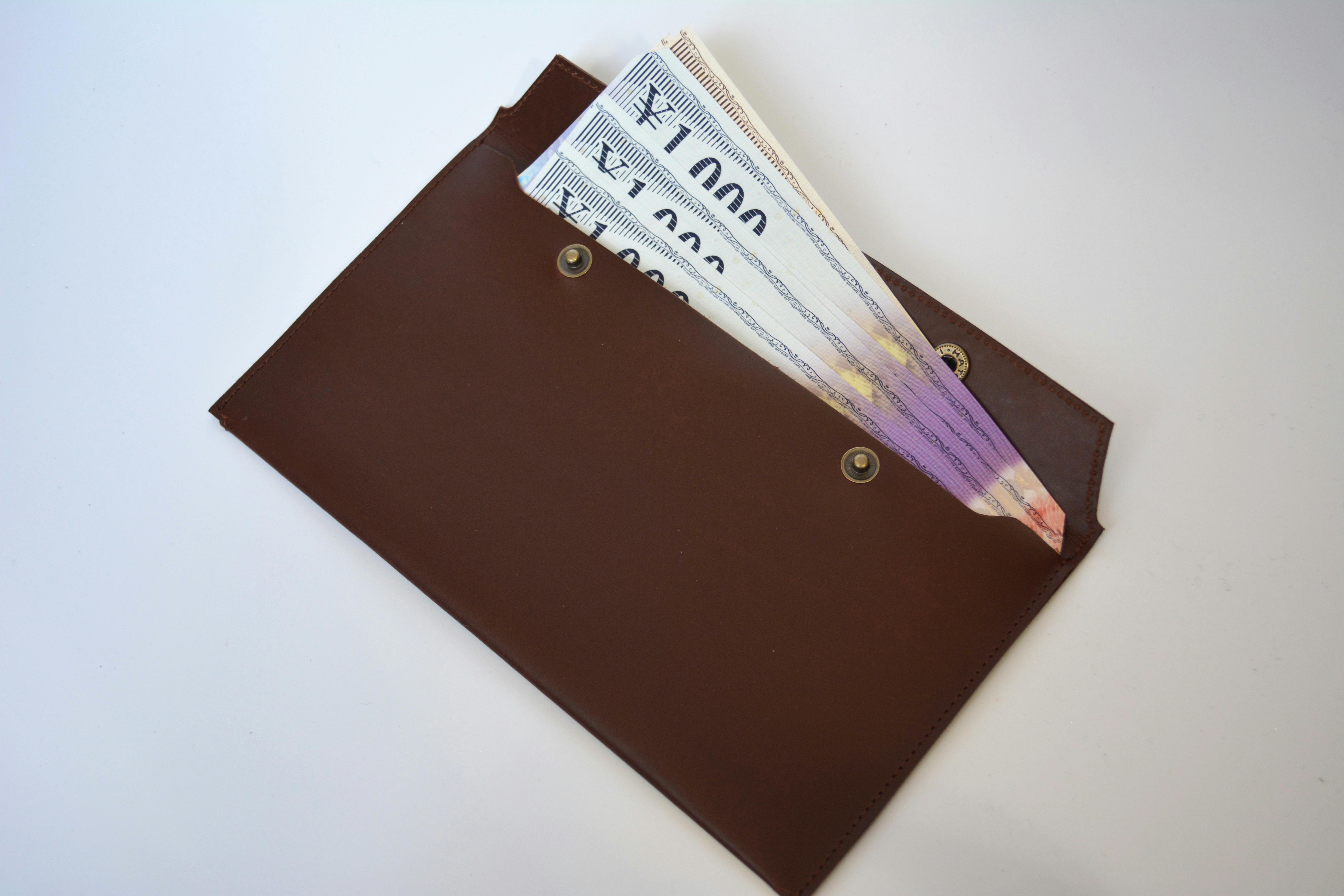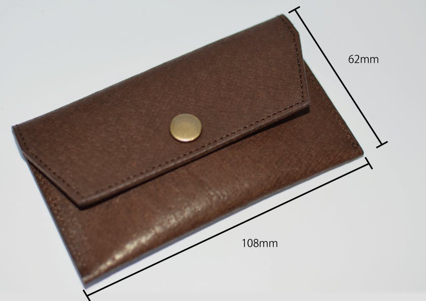 こちらは銀行の紙封筒から人前でお金を出すのがちょっと恥ずかしい、という作者本人の思いからできたアイテムです。お札や商品券などが出し入れしやすいよう計算し、実際の封筒とほぼ同じサイズで作っております。