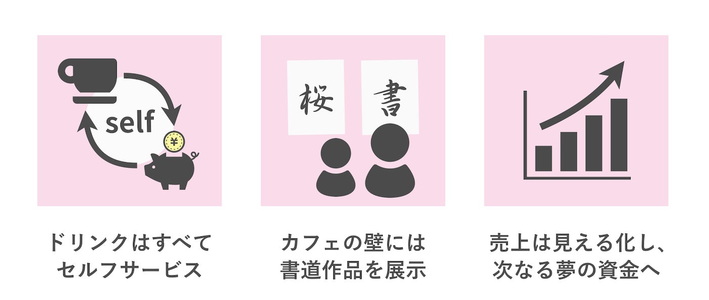 まずは手の届く範囲から。書道教室は基本的には私一人で運営していますのでカフェを開くと言っても人を雇うことはできません。