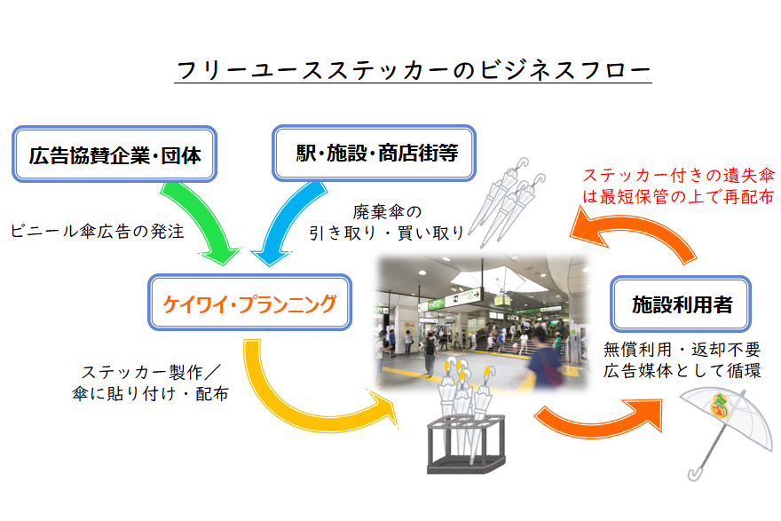 傘はリユースにより社会の様々なところを循環します。フリーユース傘と共に広告も様々な人の目に触れる事でしょう。