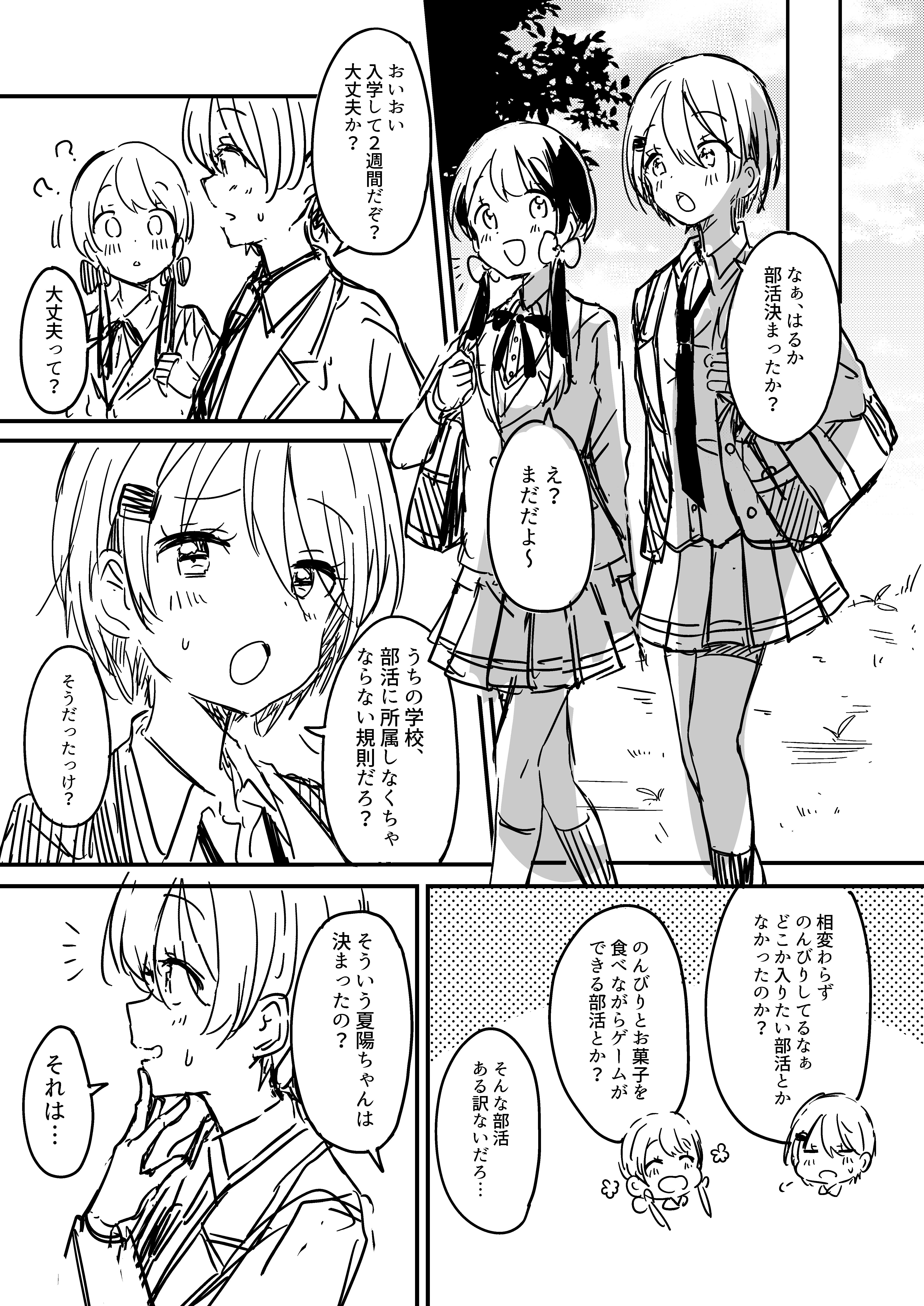 中学時代はゲーム三昧だった主人公・はるかは、高校に入学したら、ゲームができて美味しいお菓子を食べさせてくれる部活に入りたいと思っていた。新しく入学した高校にはゲーム部はなく、もちろん、美味しいお菓子を食べさせてくれる部活もあるはずがなかった。