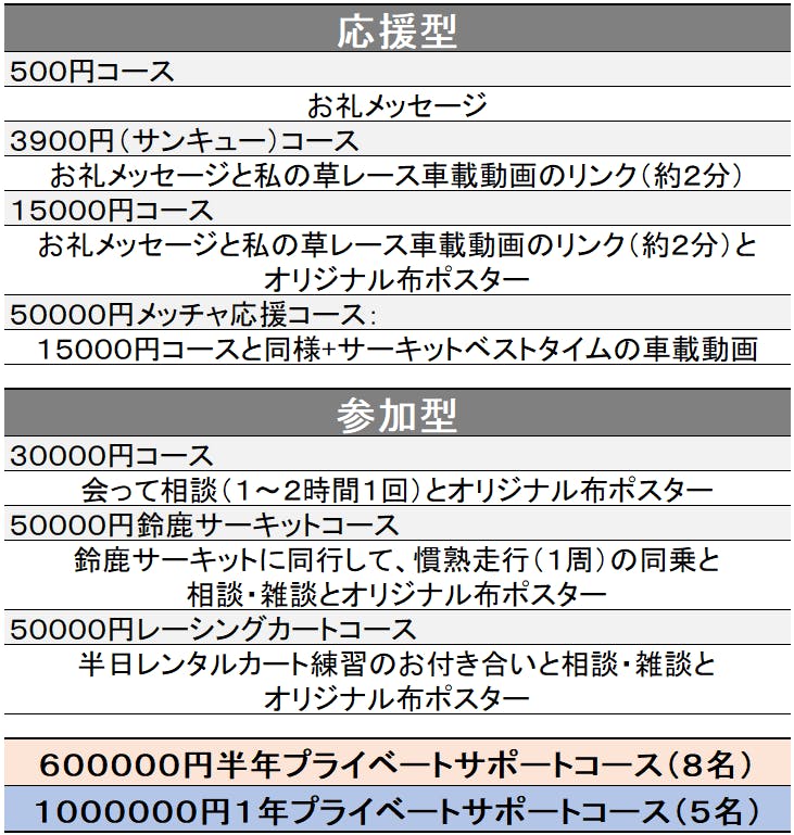 イベント等以外は原則1対1でのお手伝いになりますので、ファンド金額はそれなりになってしまいますが、モータースポーツ自体にかけるお金は、予算に応じたものをご提案します。