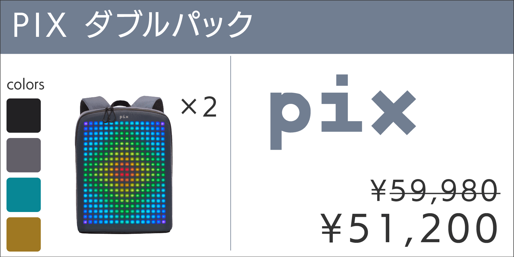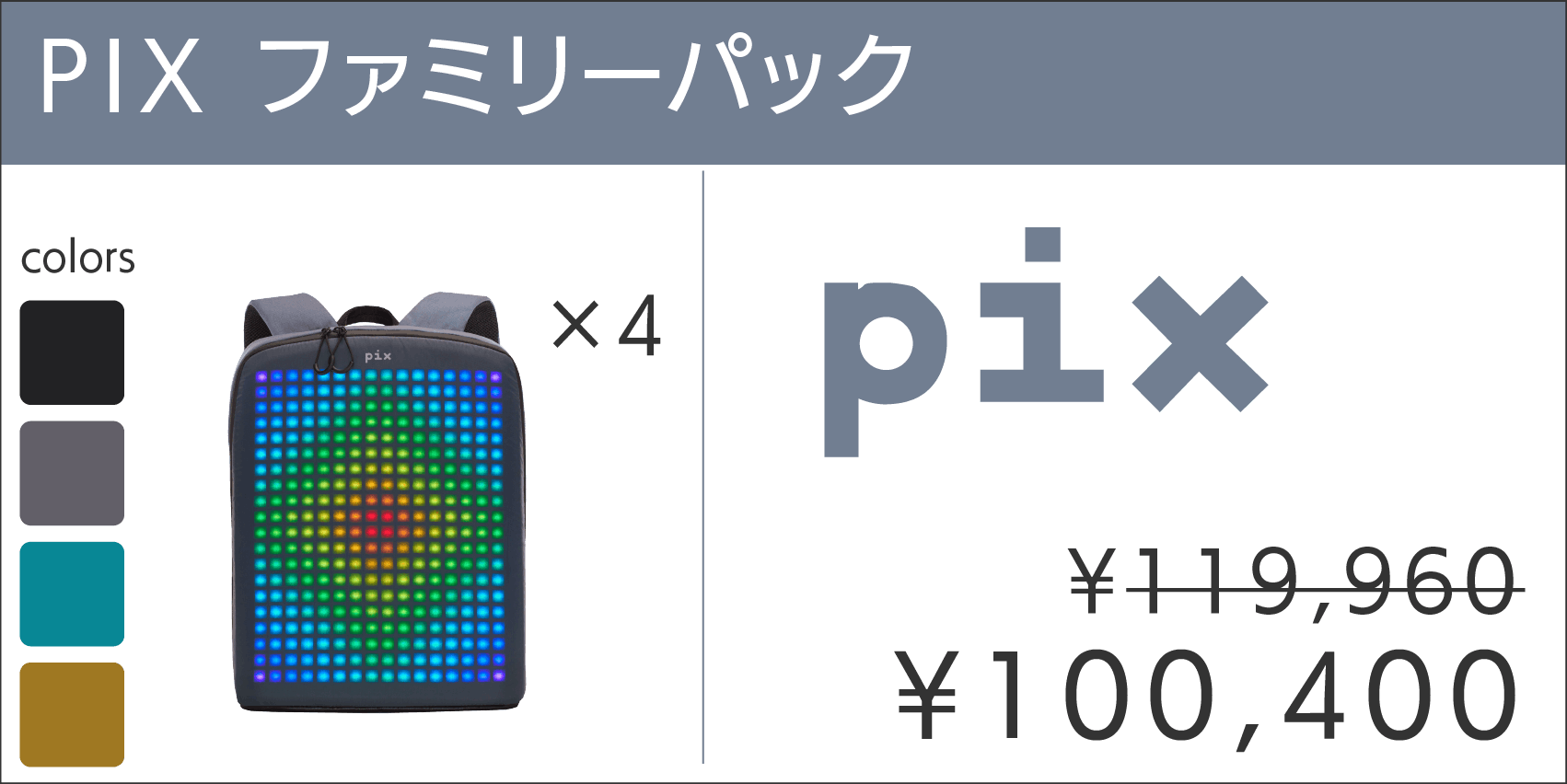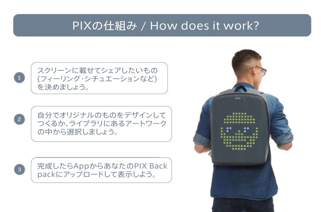PIXはiOS/Android対応のアプリで操作可能なバックパックで、ドットスクリーンを搭載し、アニメーション表示や8bitゲームをプレイできるデジタル要素を盛り込んでいます。海外のクラウドファンディングで3000万円以上の支援を集めた注目のバックパックが日本に上陸です。