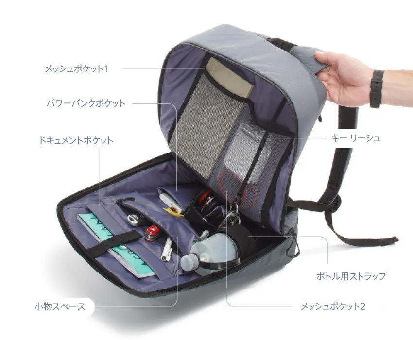 PIXはドット絵を表示できる液晶だけが特徴ではありません。普段使いのバックパックとしても使い易いように機能設計しました。メインアクセスは大きく開くうえ、オーガナイザーとして機能するポケットが多く設置されているので、内容物も一目瞭然で必要な物にサッとアクセス可能です。