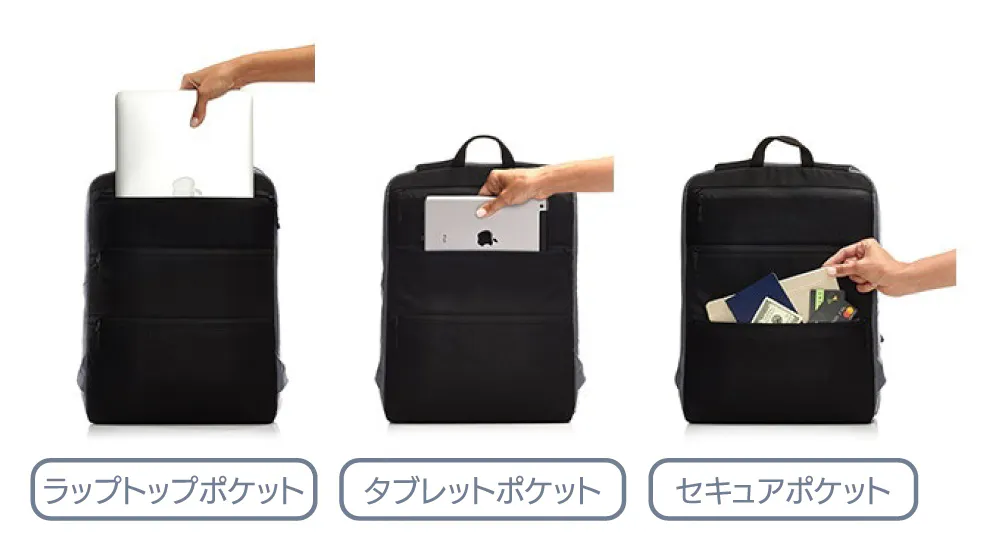ショルダーベルト側に15インチラップトップ、タブレット用のスペース、そしてセキュアな小物ポケットの3つを配置。メインスペースと合わせてこちらも荷物をオーガナイズしやすい設計となっています。