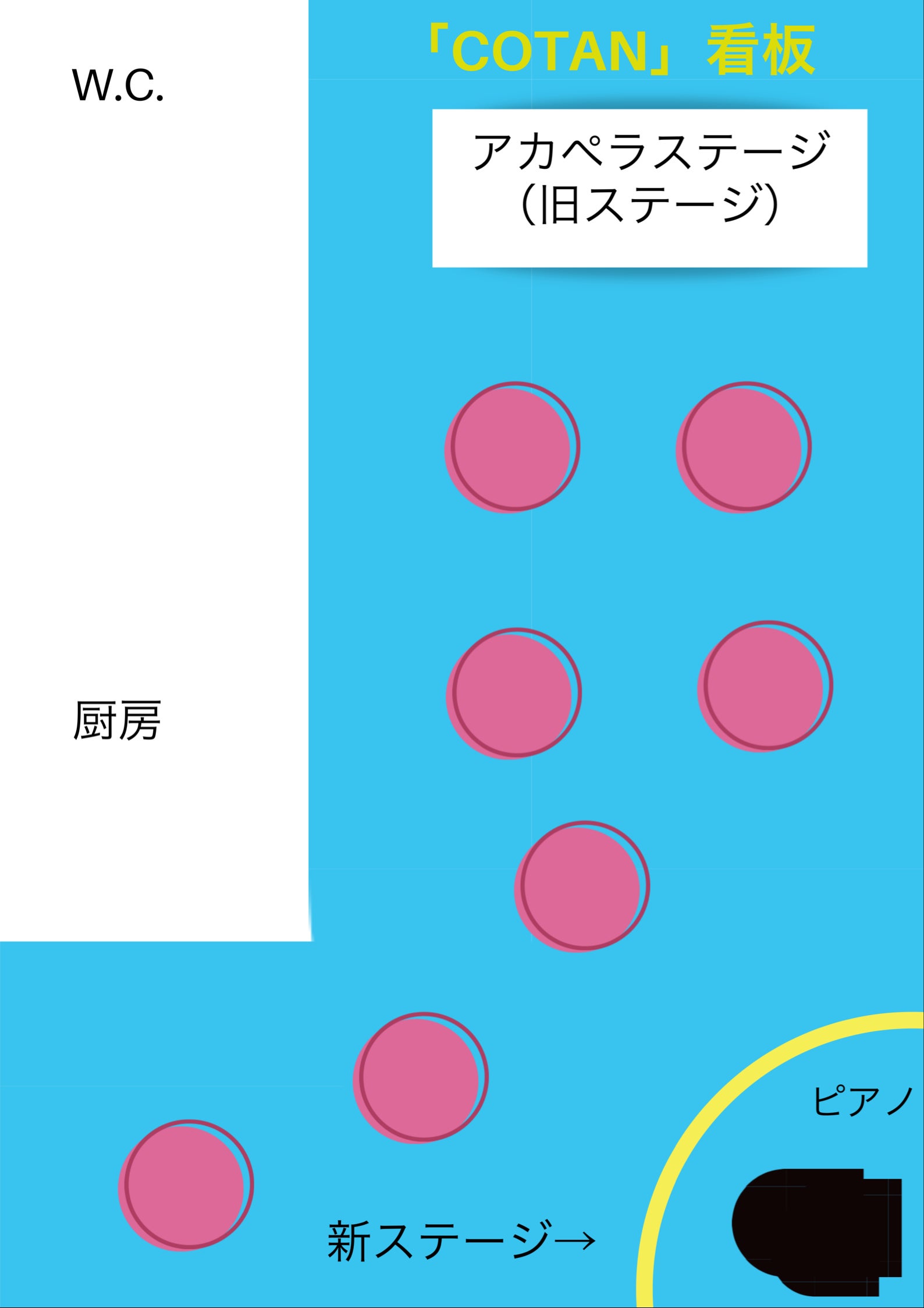 店内奥のいままでのステージは、テーブル席、もしくは、ピアノを使わないアカペラステージとして継続します。