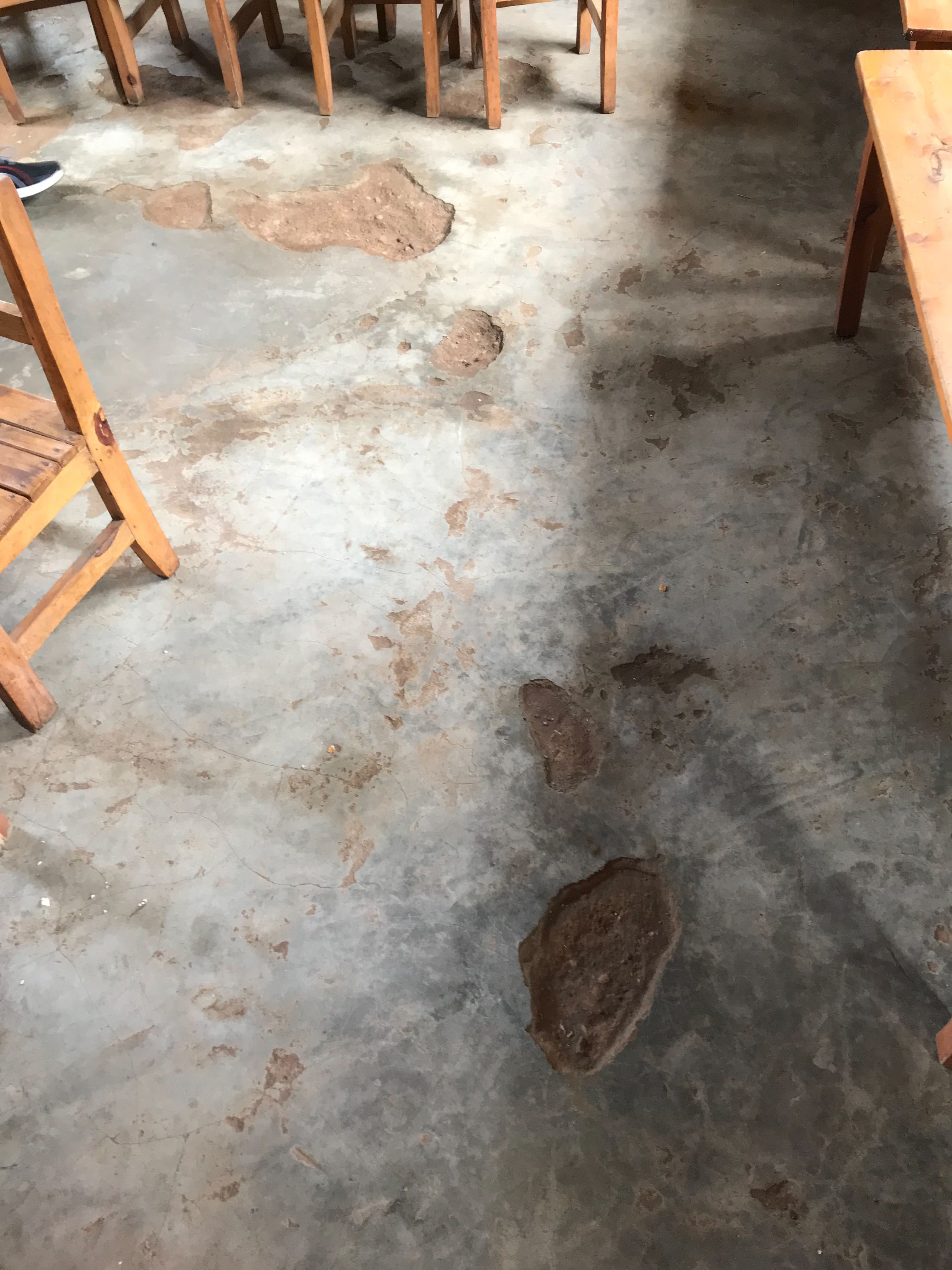 階段が高くて子どもたちは1人では登れません。雨季になると断続的に大雨が降り、未舗装の急斜面にある学校の周囲の土が崩れて落ちます。屋根がない教室は水浸しになってしまいます。