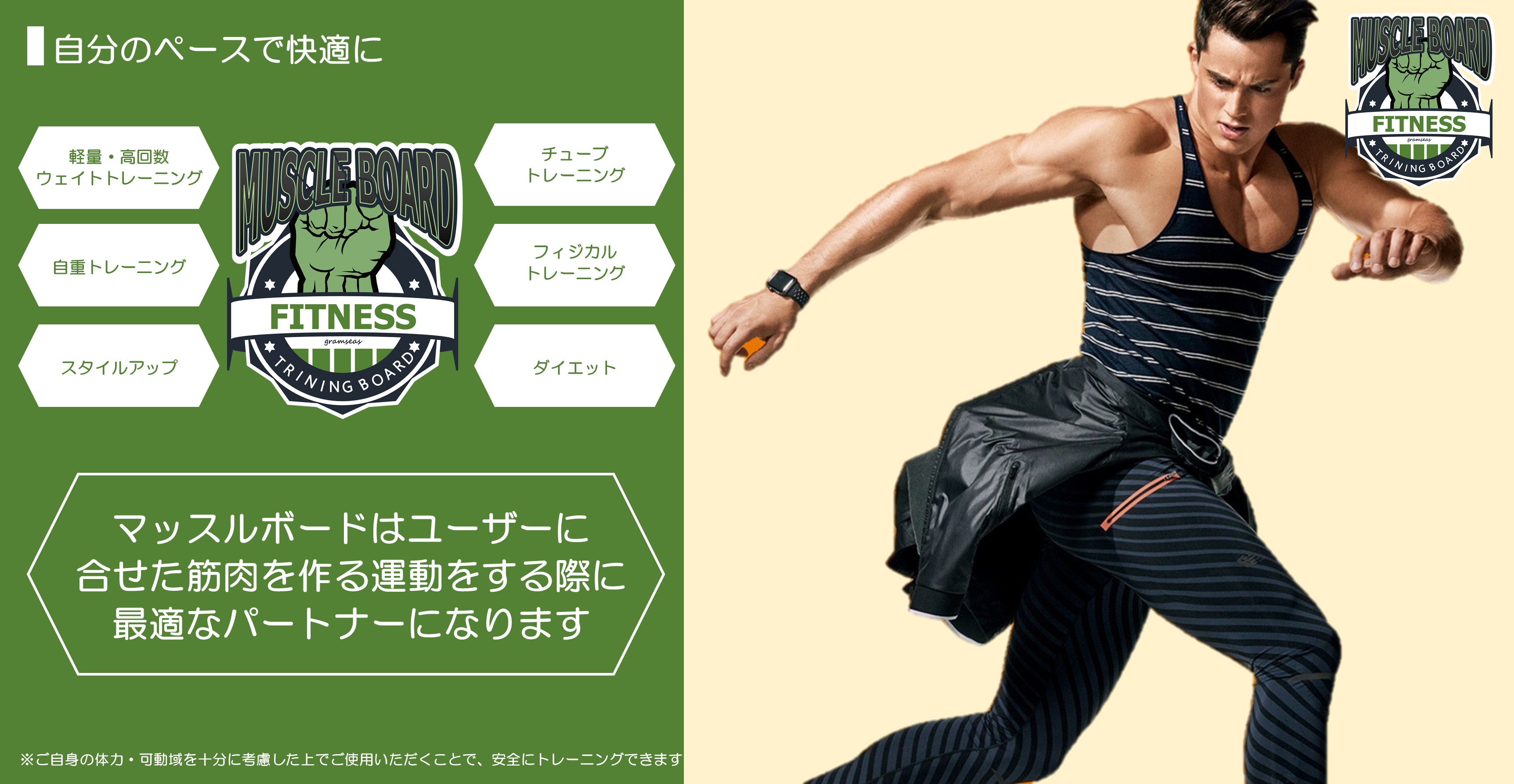 マッスルボードは、ウエイトを使わない筋肉トレーニングのワークアウトをカスタマイズして行う便利なツールです
