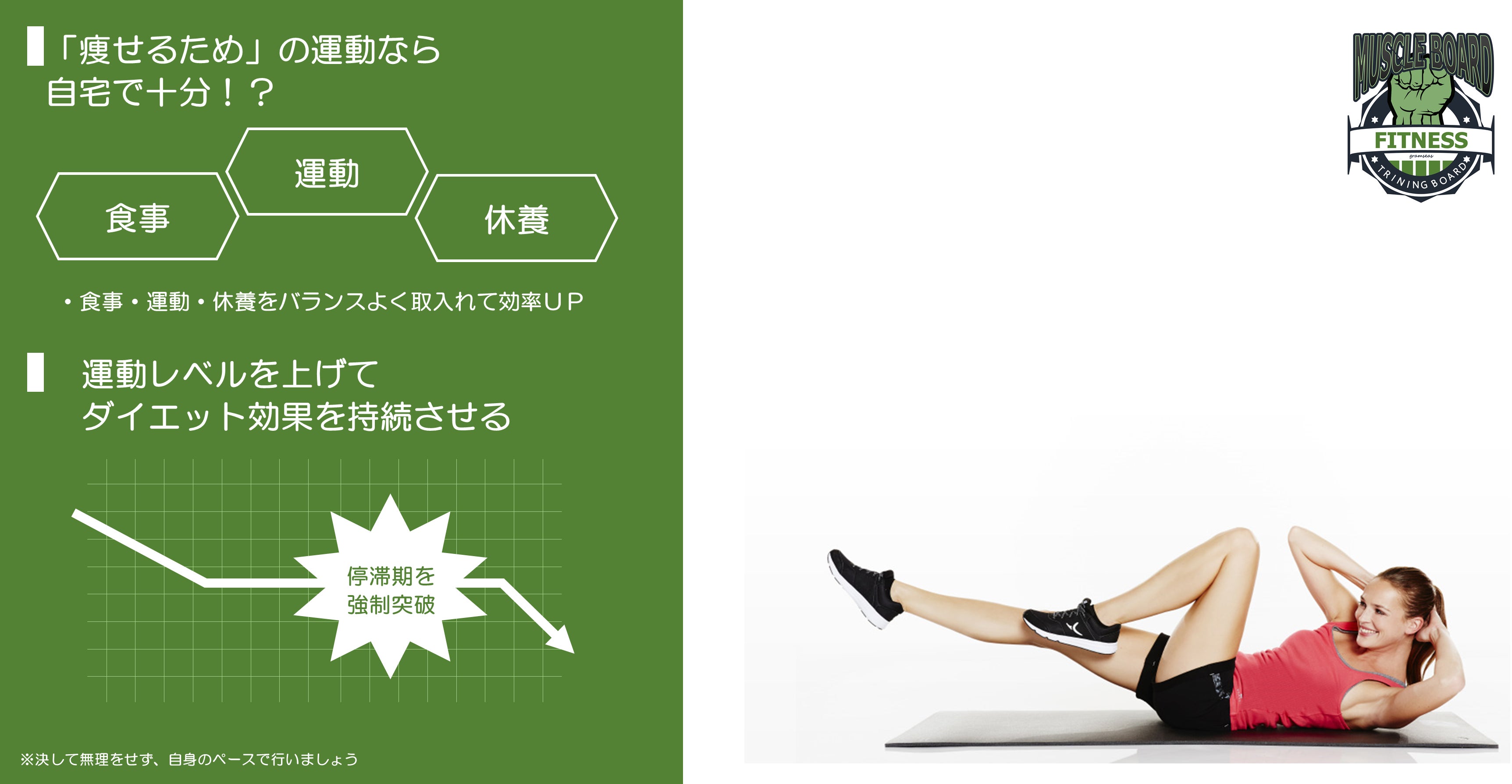 マッスルボードは、ウエイトを使わない筋肉トレーニングのワークアウトをカスタマイズして行う便利なツールです