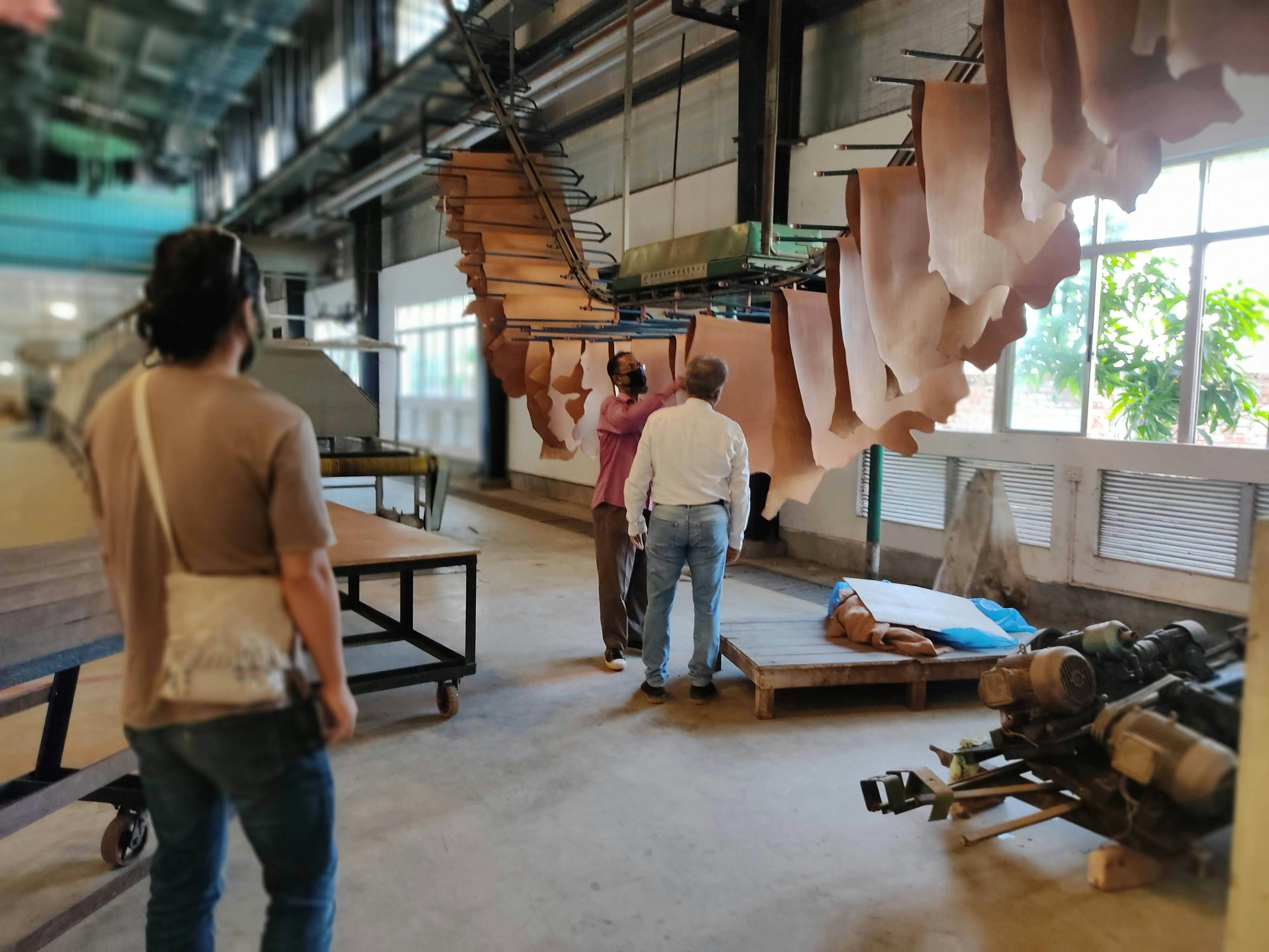 オリジナルレザーの完成に向けてタンナリーを訪問。