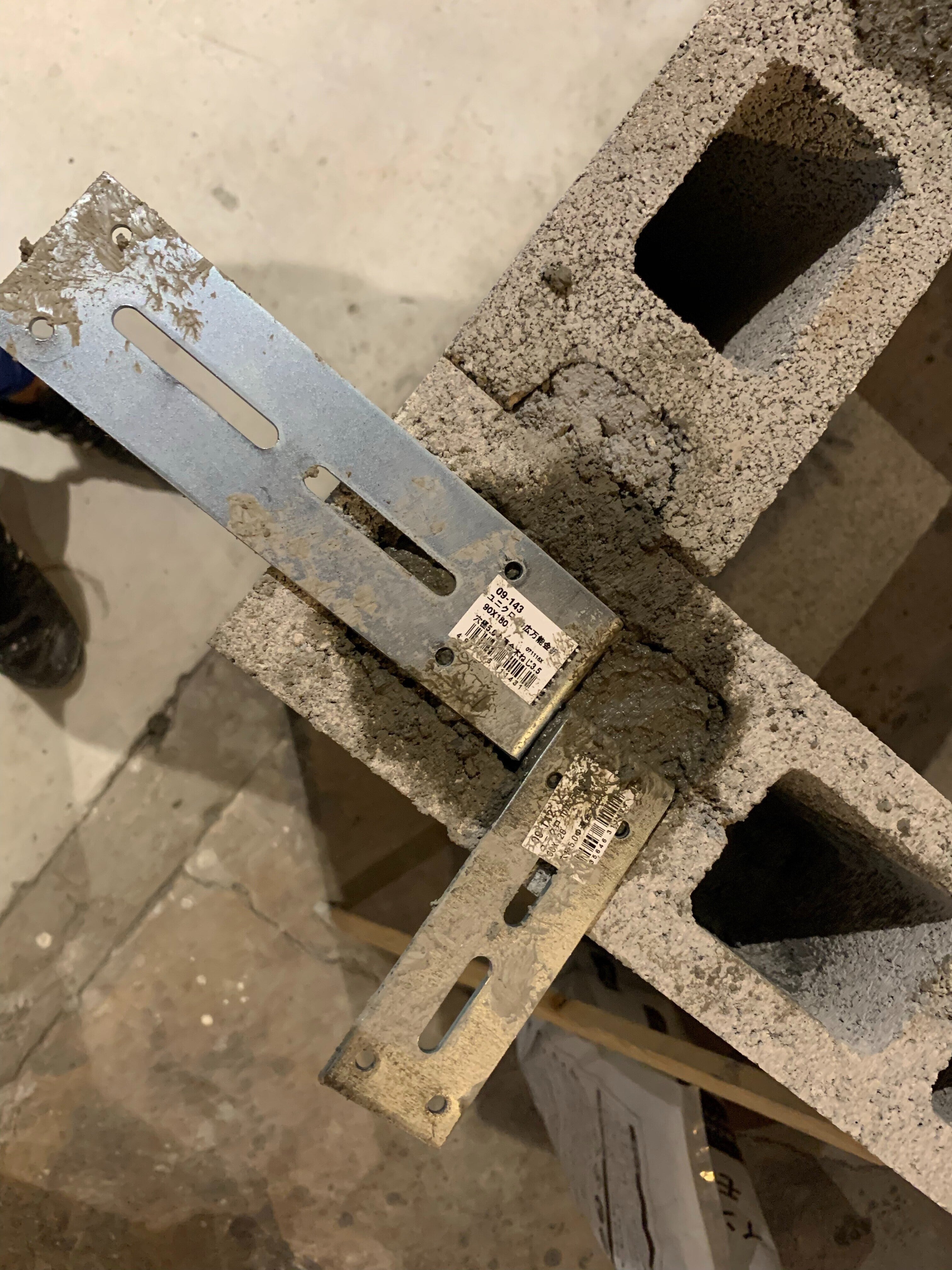 ブロックの穴にL字型の金具を埋め込み、天板の下からビスで補強します。