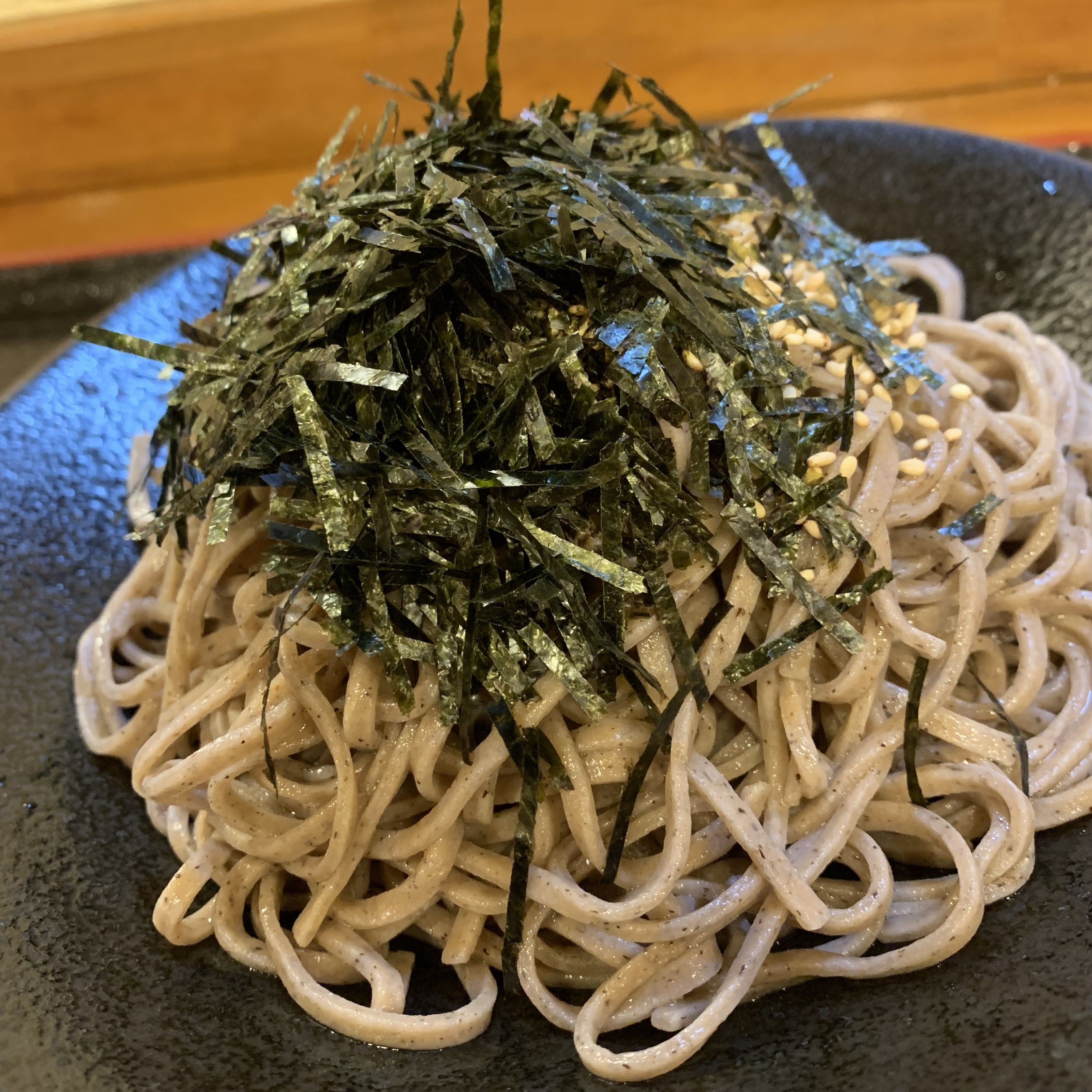 山のような形で盛られたお蕎麦にはたっぷりの白ごま、ネギ、海苔のトッピングがまた山のような形で盛られています。