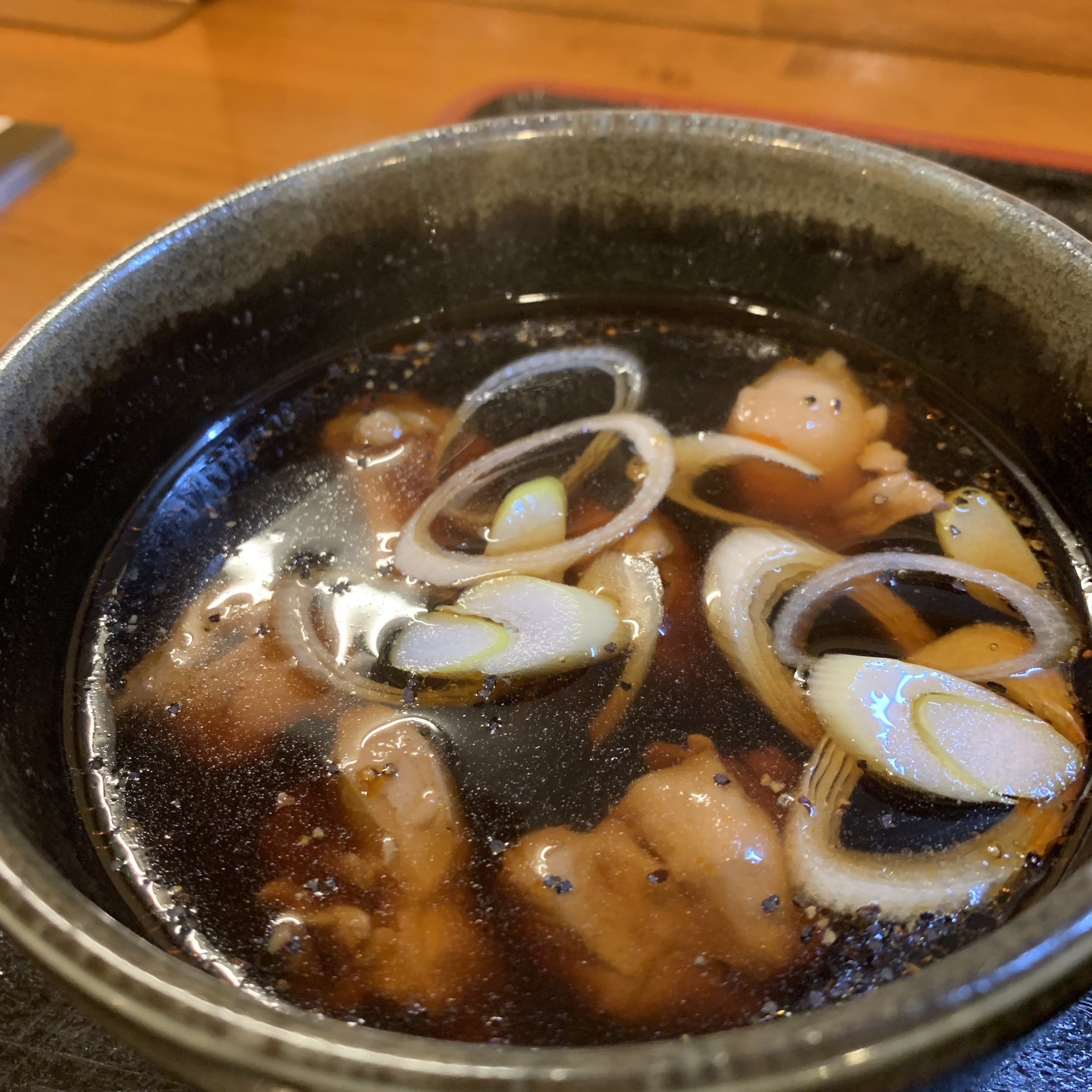 佐川さん特製出汁の入ったおつゆ。鶏肉とネギ、黒コショウとラー油でピリ辛なアクセントが加えられています