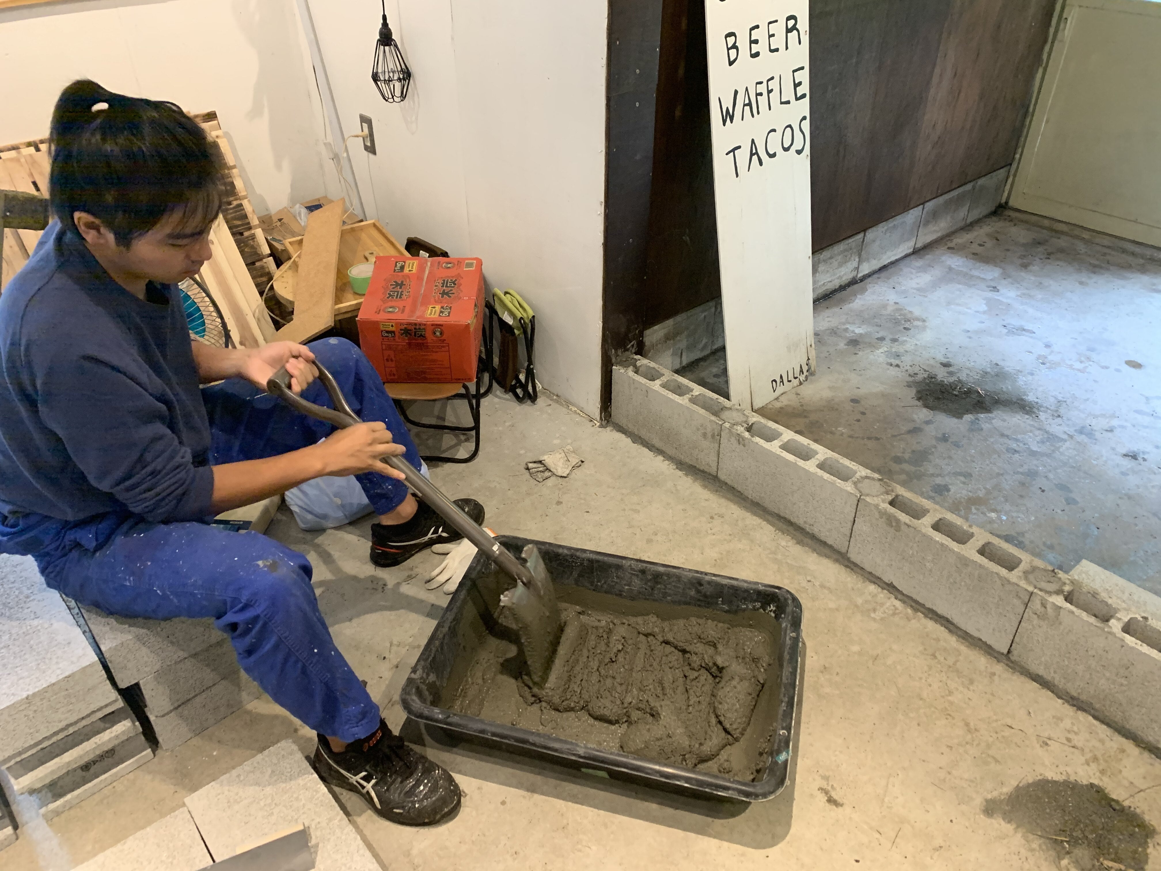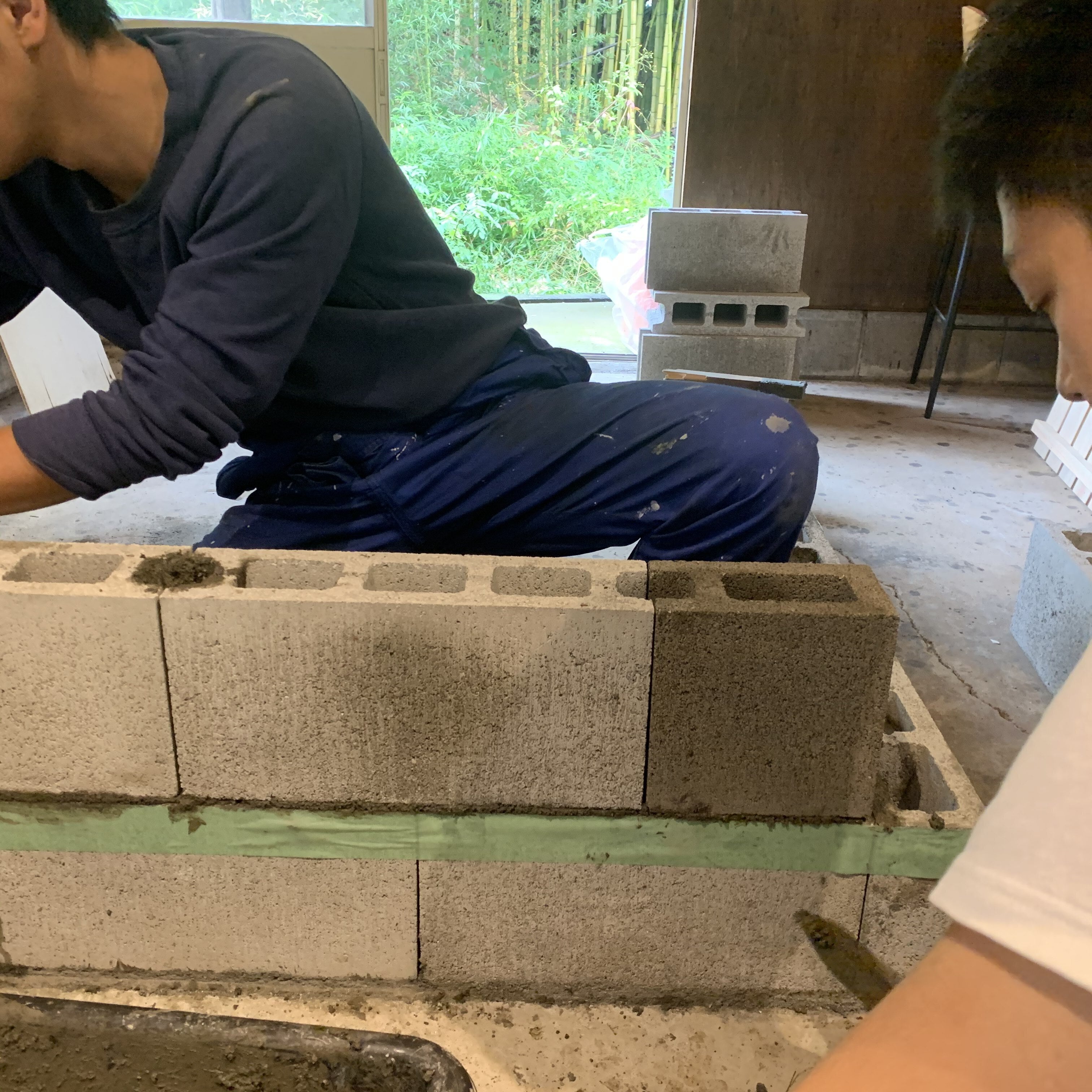 見事に固まった1段目の接地面にモルタルを塗りたくり、普通のブロックと軽量ハーフブロックを組み合わせて段ごとに互い違いになるように組み上げていきます。