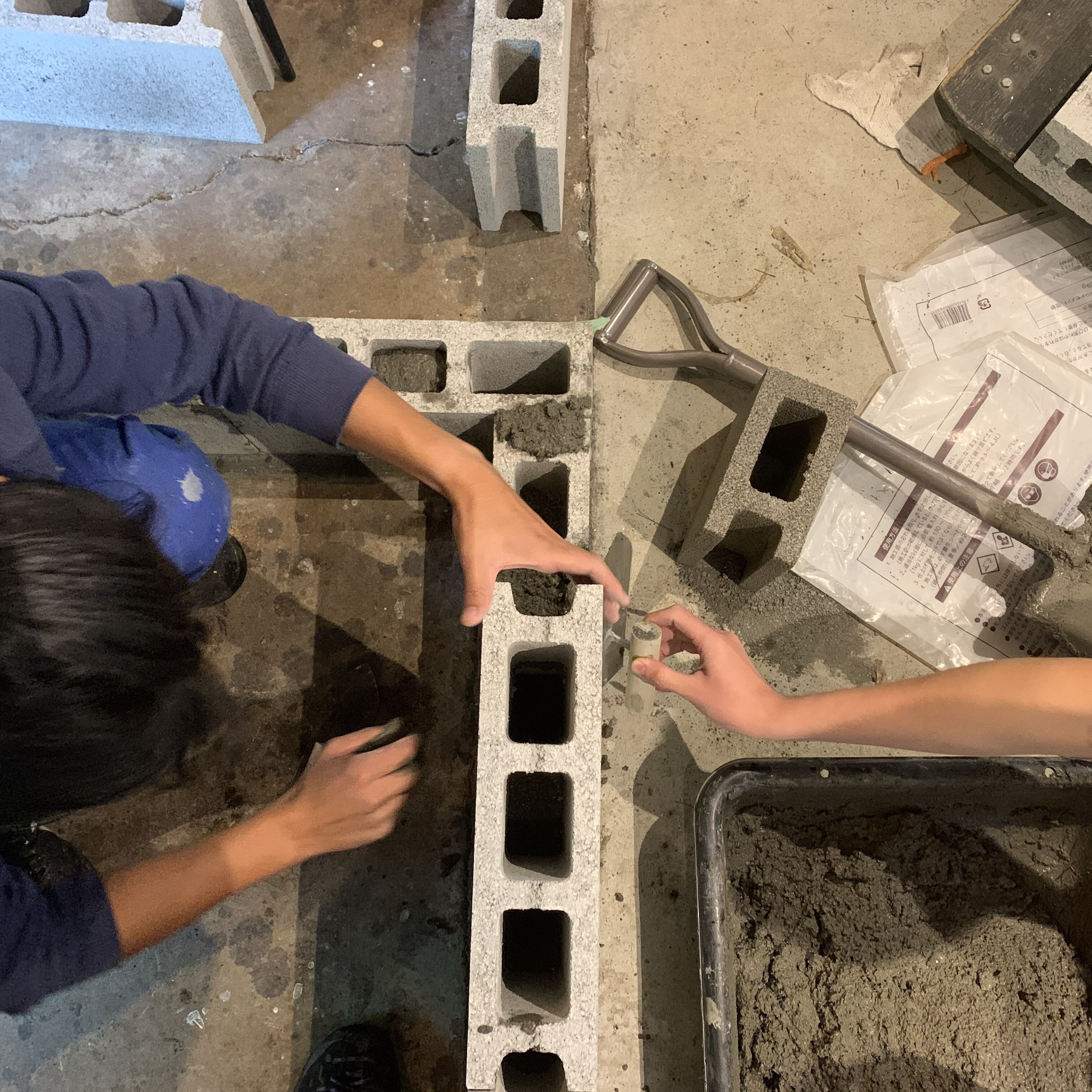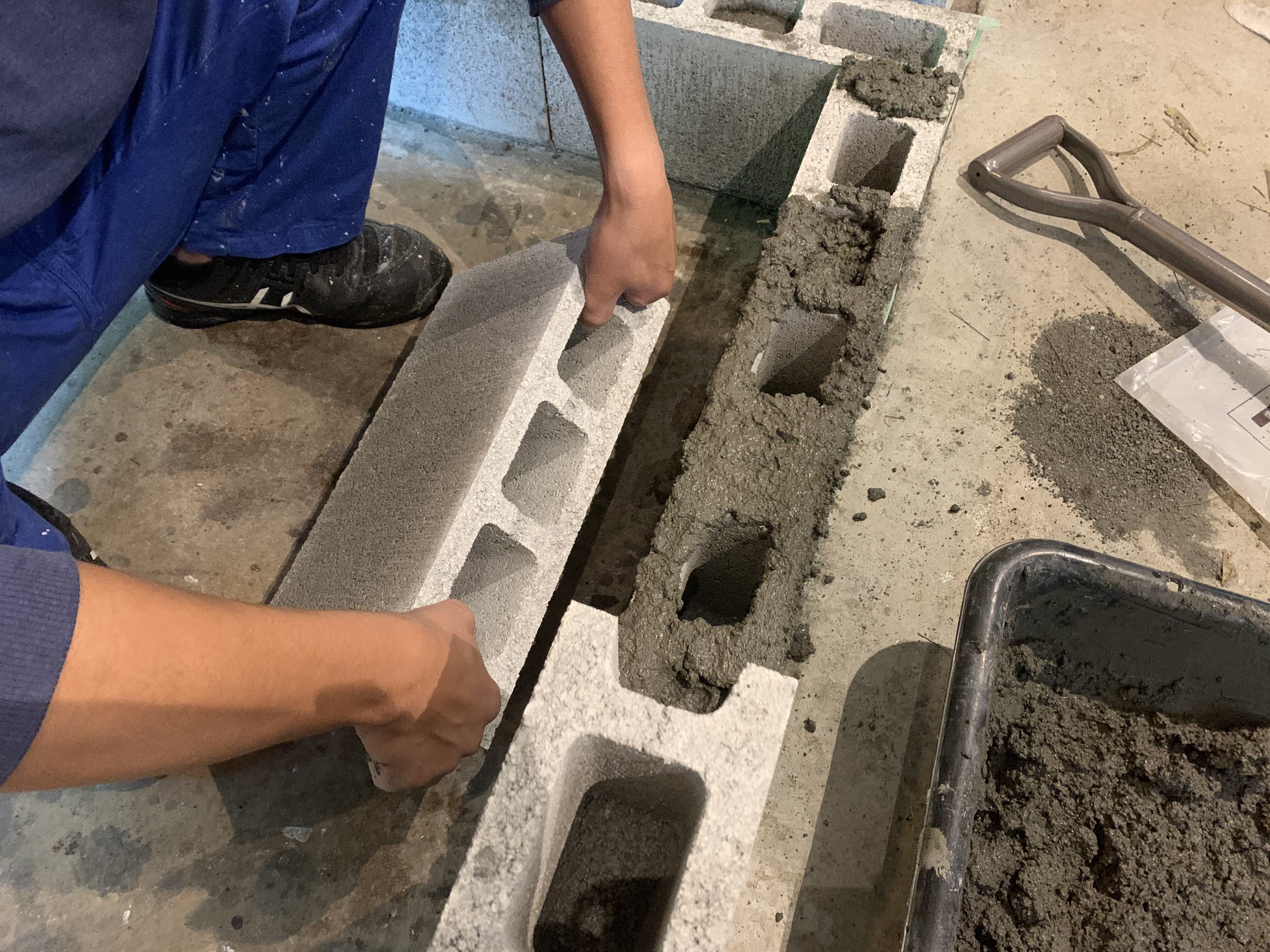 ブロック穴に交互にモルタルを流し込んで固めているのですが、互い違いに組んでいくことでより強度が増します。
