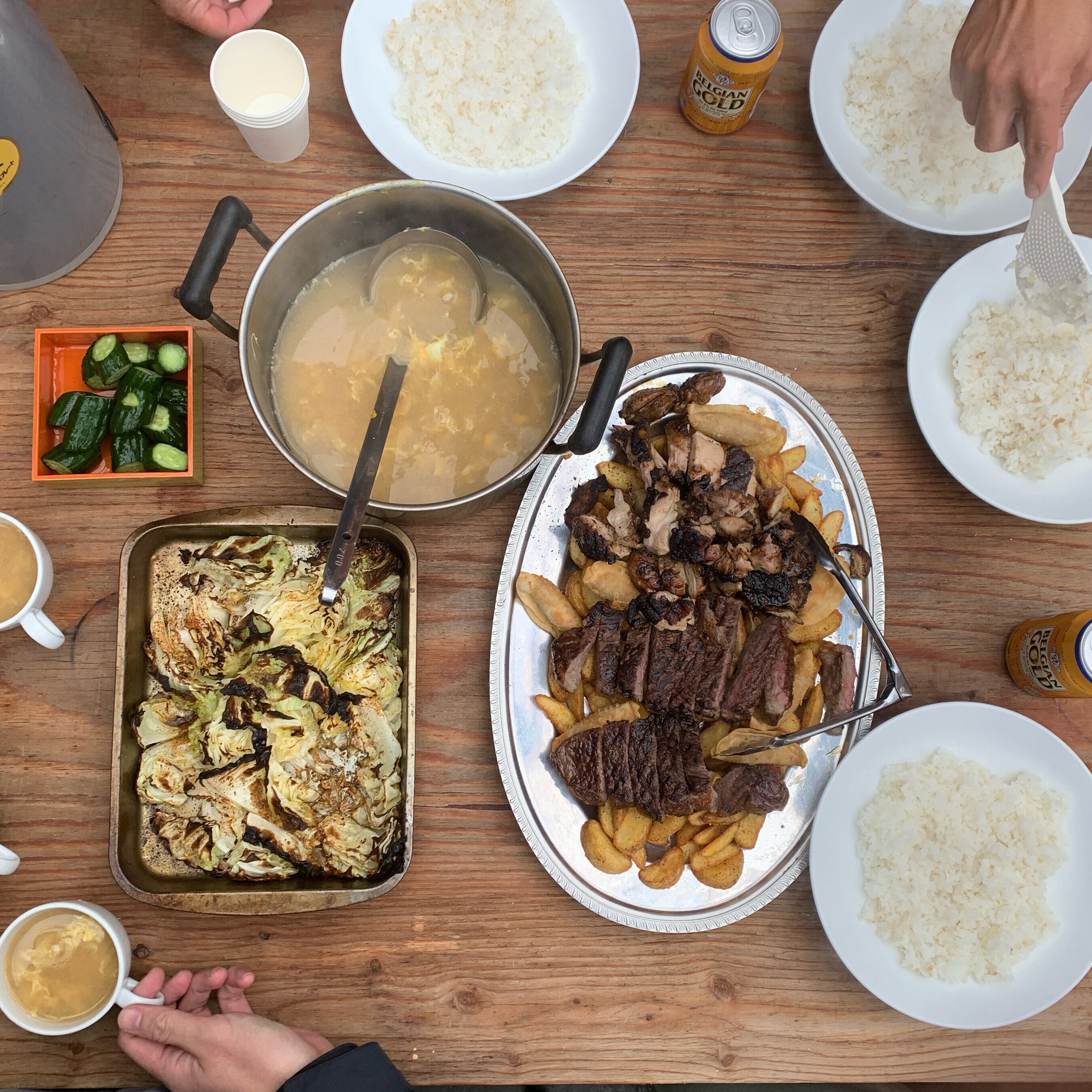 泥遊び(モルタル塗り)をしている間に名口パパがめちゃくちゃ豪華なメシを作ってくれました。