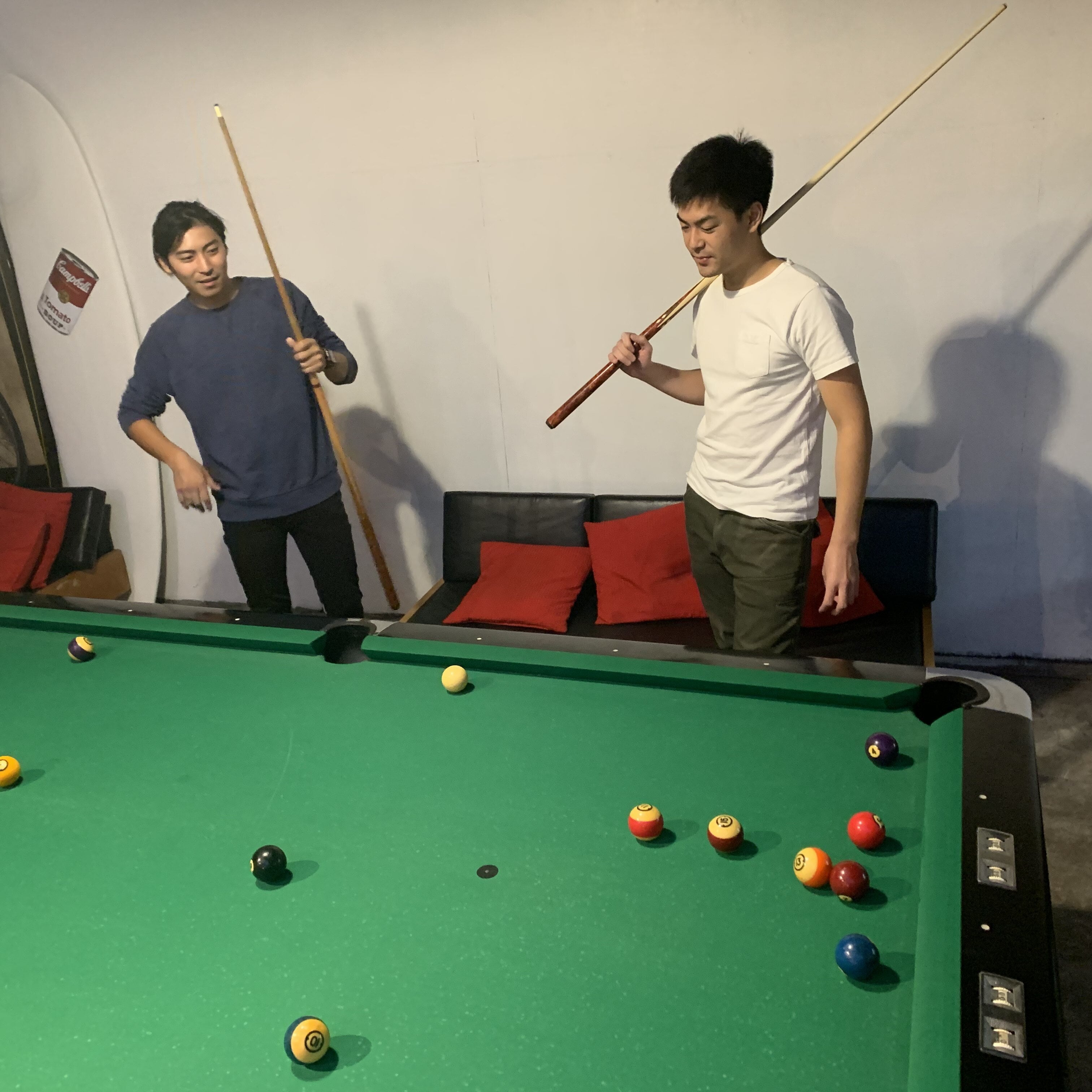 今日の作業が無事終わり、共有スペースに新設されたビリヤードを楽しむメンバー。