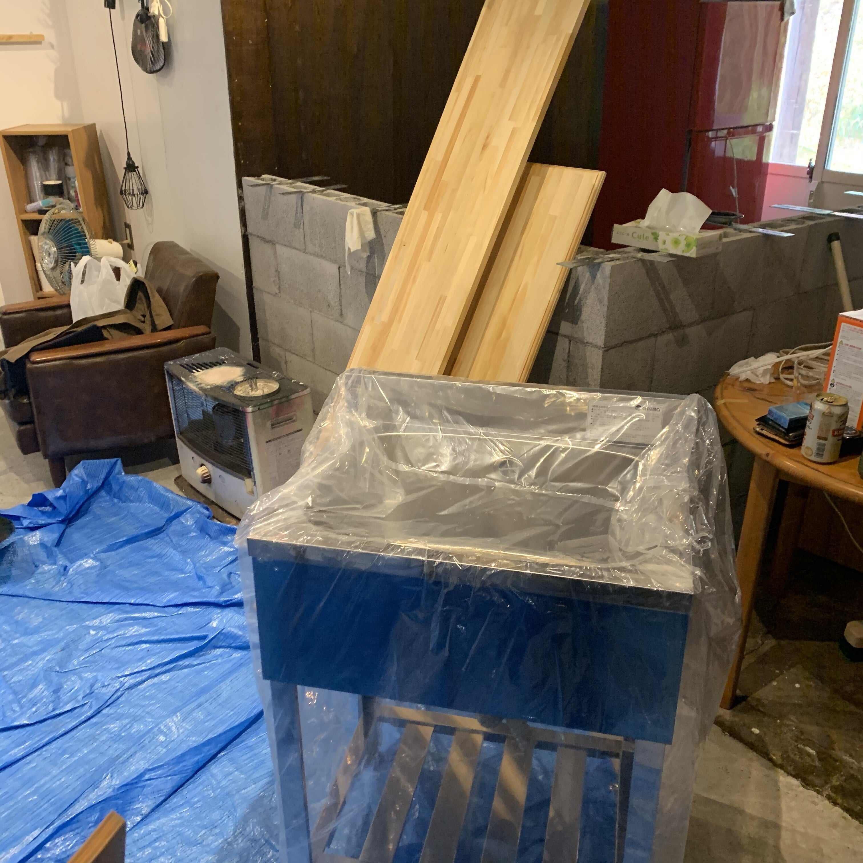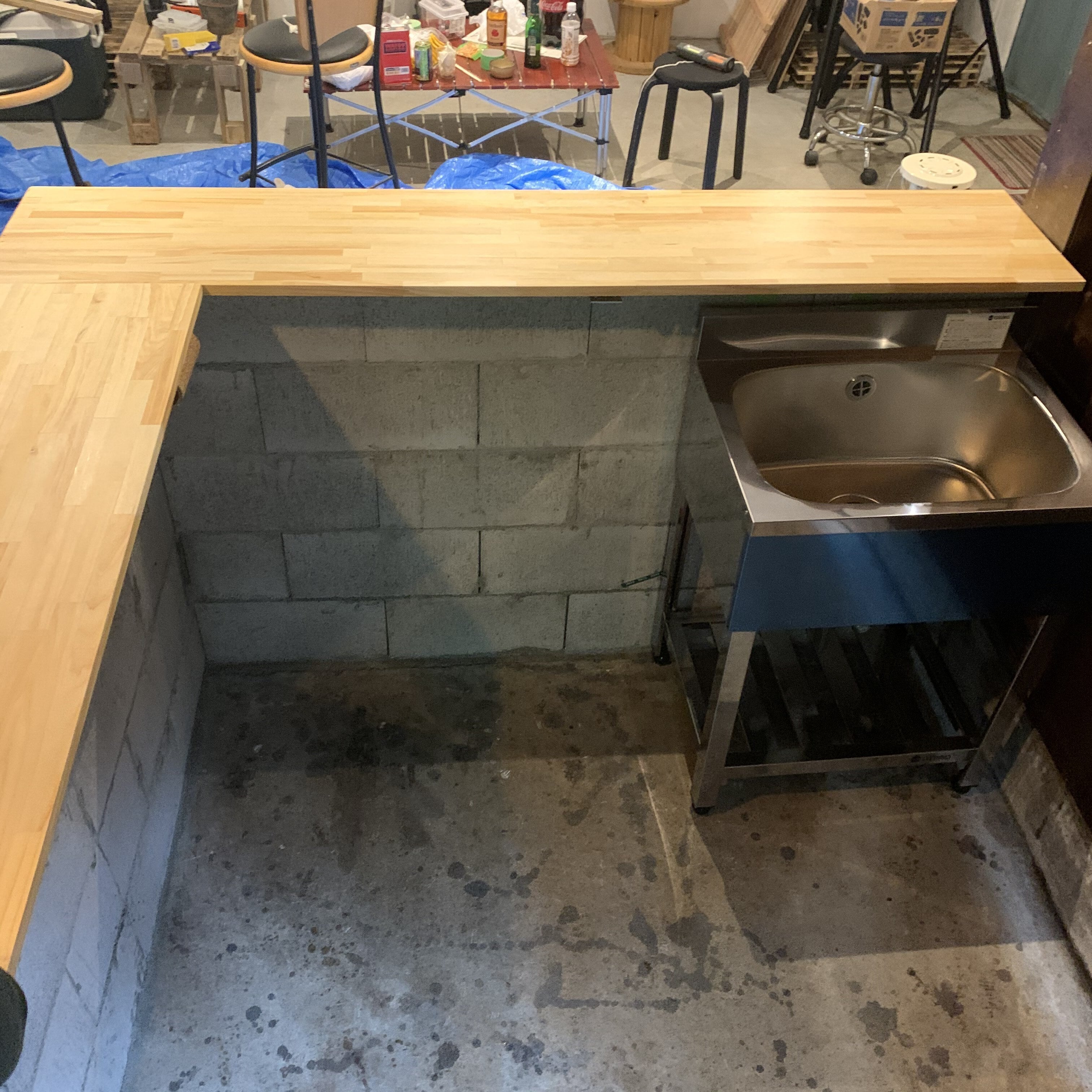 仮で置いた板とシンクの姿に完成形を想像してワクワクしたところで、