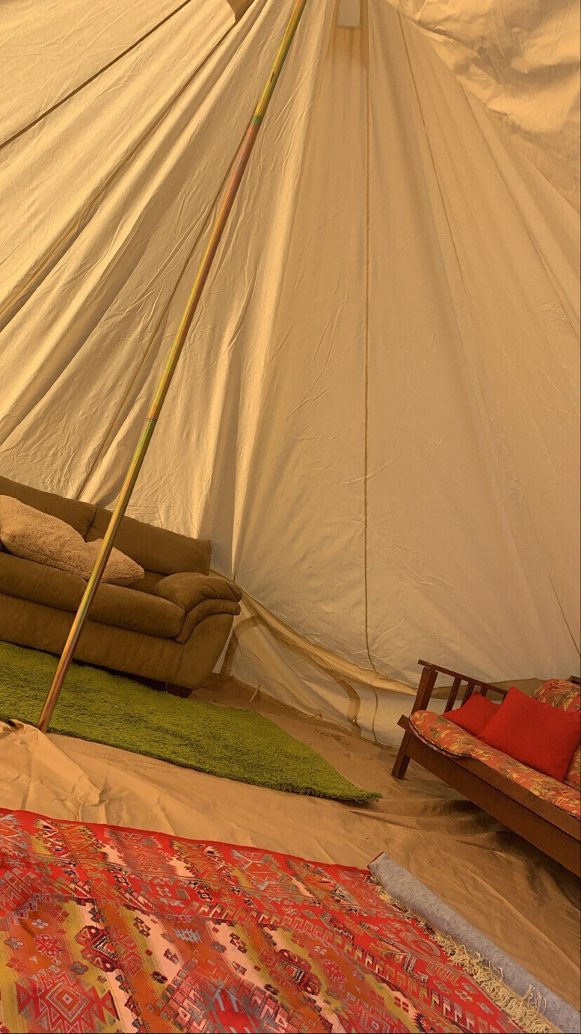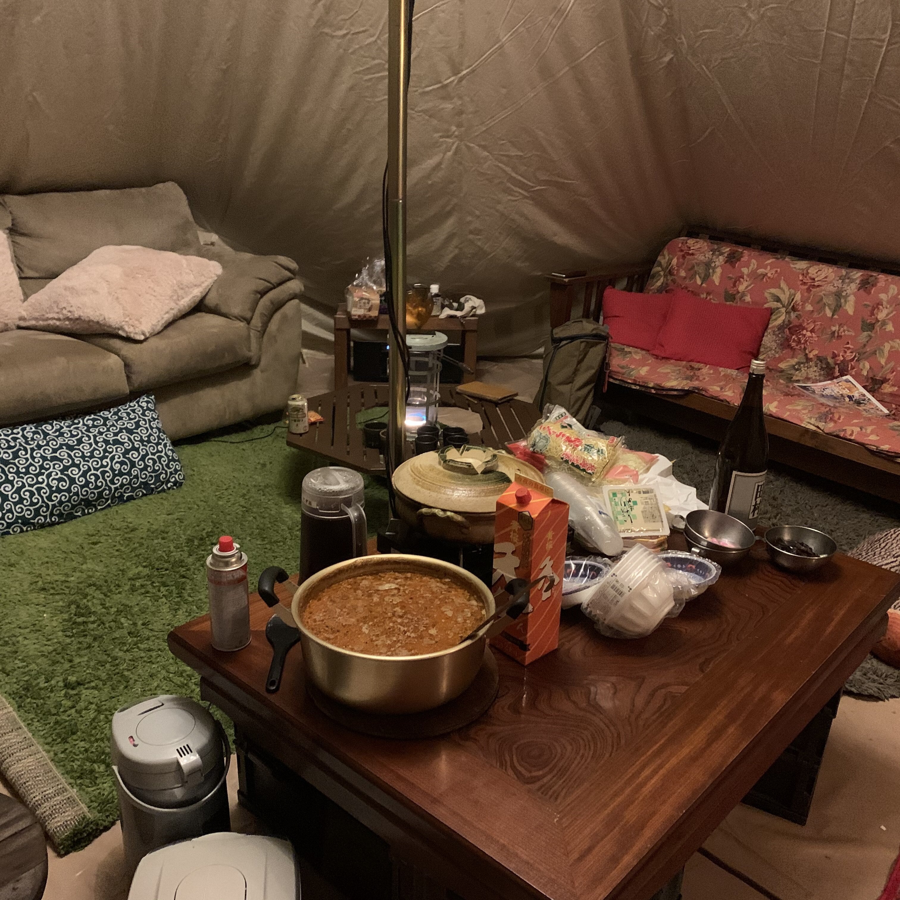 このソファは座るものとしてだけでなく、外から吹いてくる風に対してテント全体を支える重りとしても活用しています。