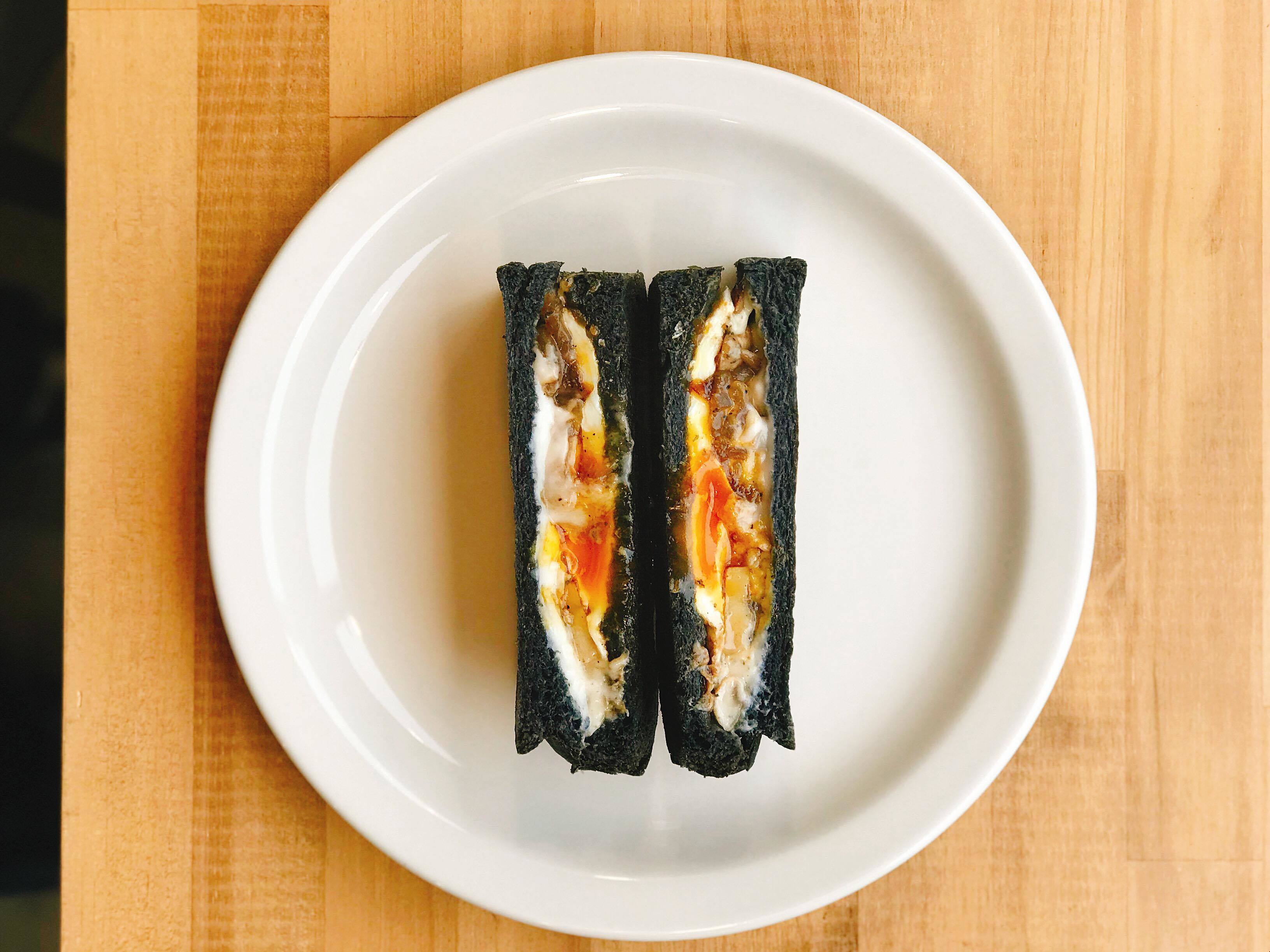 グリルドマッシュルーム (竹炭とこんにゃくを配合したパンにマッシュルームとホワイトソースと目玉焼きを挟んだサンドウィッチです。)