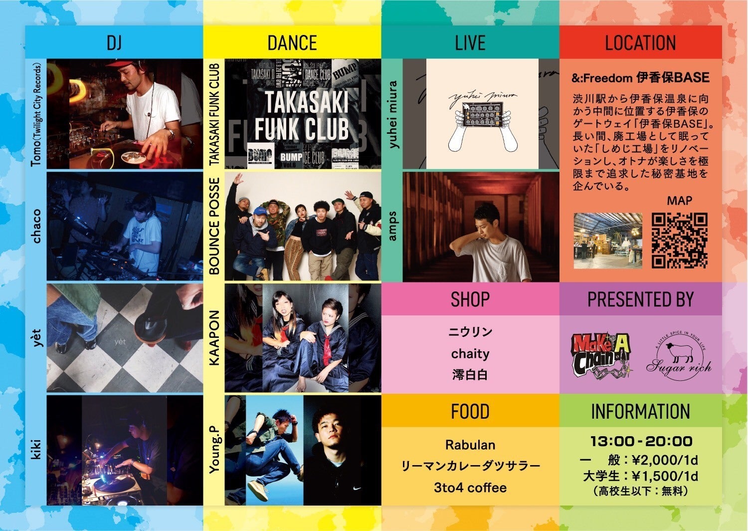 他にもDJをしたり、クリエイティブ集団sugar richの活動に参加したり、カズアキさんが多方面で楽しいことに挑戦していく中で作り上げた人脈がフルに活きている出演陣です。