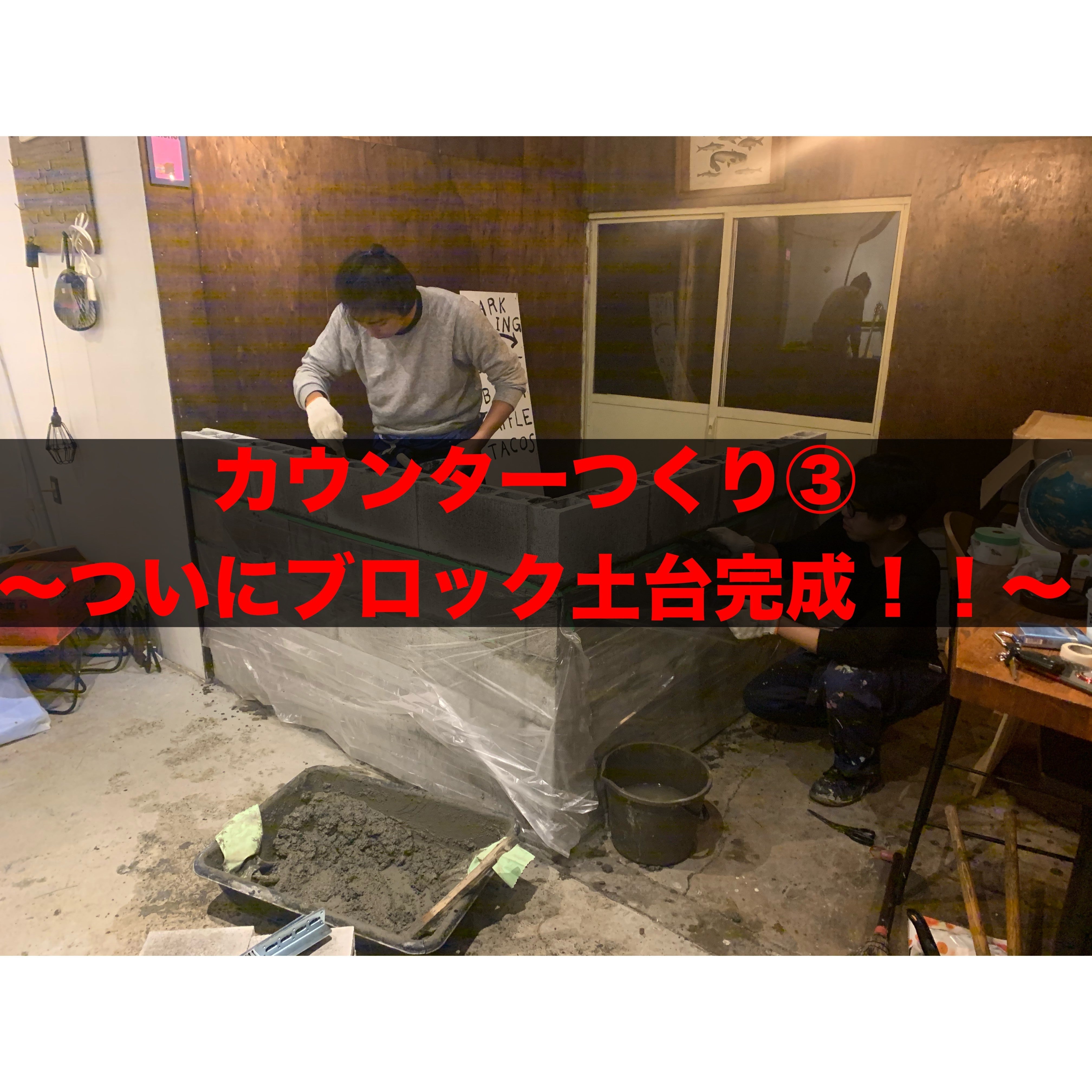皆さんこんにちはこんばんはおはようございます!Junmanjiプロジェクトのイッセイです!大変長らくお待たせしました。お待たせしすぎたかもしれません。本日遂にキッチンカウンターづくりにとりかかりました!シンプルながらもシャレた感じでキマるブロック石によるキッチンカウンター。今回は土台となる1段目の基礎作りの工事を行いました!その様子を報告していきます!本日参加のメンバー及びその近況:イノ、オカムラ、イッセイ・イノ →最近、バイク買ったいい感じにサマになっててなんかむかつくね。・オカムラ → 最近、ハンバーガー屋でお気に入りのTシャツにマスタード派手にこぼしたこれはこれでそういうガラだったっぽくなってるからいいんじゃない?元気出して。おれだったら着ないけどね!・イッセイ → 最近、「俺のそば」が閉店したショックからまだ抜け出せないところがどっこい嗚咽してるフリしてよだれ拭いてるだけです。そんなこんなな僕ら3人で今回はお送りしていきます。さあ、台風を経て曇天というにふさわしき天気の中スタート。朝10時に集合、のはずが棟梁イノ君寝坊。予定通りに集合したオカムラとイッセイでカインズホームへ必要材料の買い出しへ。ブロック石40個弱とモルタル、モルタル用の左官道具を買ってから気づきました。「車1台に乗らないぞこの量・・・」ブロック石40個て想像以上にすごい量でした。しかしそこは僕らのカインズホームさん。一定条件のもと軽トラを無料で貸し出してくれる「サービスカー」なるサービスがあり、利用することにしました。軽トラを利用して1往復ですべてJumanjiへ搬入完了。※仏頂面のオカムラですが「カインズホームありがとう」という感情で満ち溢れていますそんなこんなでお昼過ぎに棟梁イノと合流し組立て開始。このブロックを5段ほど積み重ねてカウンター天板の土台となる部分を組み立てていきます。まずは仮置き。イメージしていたスペースに土台となる1段目を積んでいきます。※伸びた髪を縛っているイノですが人斬りでも生業にしてんのか、って風貌ですね。仮置きしてサイズ感に間違いがないことを確かめ、いよいよ土台作りスタート。水で練り上げてネリネリしたモルタルを・コンクリ床とブロックの間・ブロックとブロックのつなぎ目に満たしてくっつけていきます。モルタルとは水、セメントと砂 でできた左官用の建築材料のことで、コンクリートの表面の仕上げや接着に使われます。下地となる床からほこりやごみを取り除き綺麗な状態にして、軽く濡らします。こうすることで不純物や凸凹がなくなってよりよい接着ができます。※しっかり一直線になるように並べます。写真には写ってませんが水平器が大活躍します。床とブロックをモルタルで接着したら、つぎはブロックとブロックのつなぎ目にモルタルを詰め込みます。詰め込んだモルタルが乾くとつなぎ目が一体化し、それまで個々でバラバラだったブロックが一つにつながるのです。※つなぎ目にモルタルを詰め込む。あんまり強く押し込むと全体が「ウニュッ」って横ズレてしまうからちょうどいい力で押し込むのがミソ。※インスタ用の俯瞰ショットをパシャリ。 コーナー部分には角用の「コーナー」と呼ばれるブロックを使用しています。こうして「並べる→モルタル詰める→並べる」の作業をすること1時間半。なんとか土台となる1段目が形になりました!右側の壁とつながっていない部分ですが、パタン式の扉を作るために敢えてこのままにして空けてあります。パタン式の扉というのは僕の勝手な呼称ですが、飲食店の厨房によくあるあのタイプの扉です。西部劇で街を牛耳る悪党がバターーーン!てやるああいう開閉の仕方をするやつ。さあ、そして2段目、、、と行きたいところですが本日の作業はここまでです。このブロックを5段積み上げていくのですがモルタルが乾かないまま一気に進めると不安定になってしまうので何日かに分けて段階的に進めていきます。2日後くらいに様子を見て乾き具合、固まり具合をチェックします。もしこれで足で軽く小突いただけでズレてしまうようなら組みなおします。泣次回の作業予定日は10月22日、27日。この2日でブロック石を積み上げと補強をします。ブロック積み上げが終わったら次なる作業「天板設置」に取り掛かっていきます。予定通りいくといいなあ。。。以上、本日の作業報告でした。これからのカウンターづくりの進捗にご期待ください。
