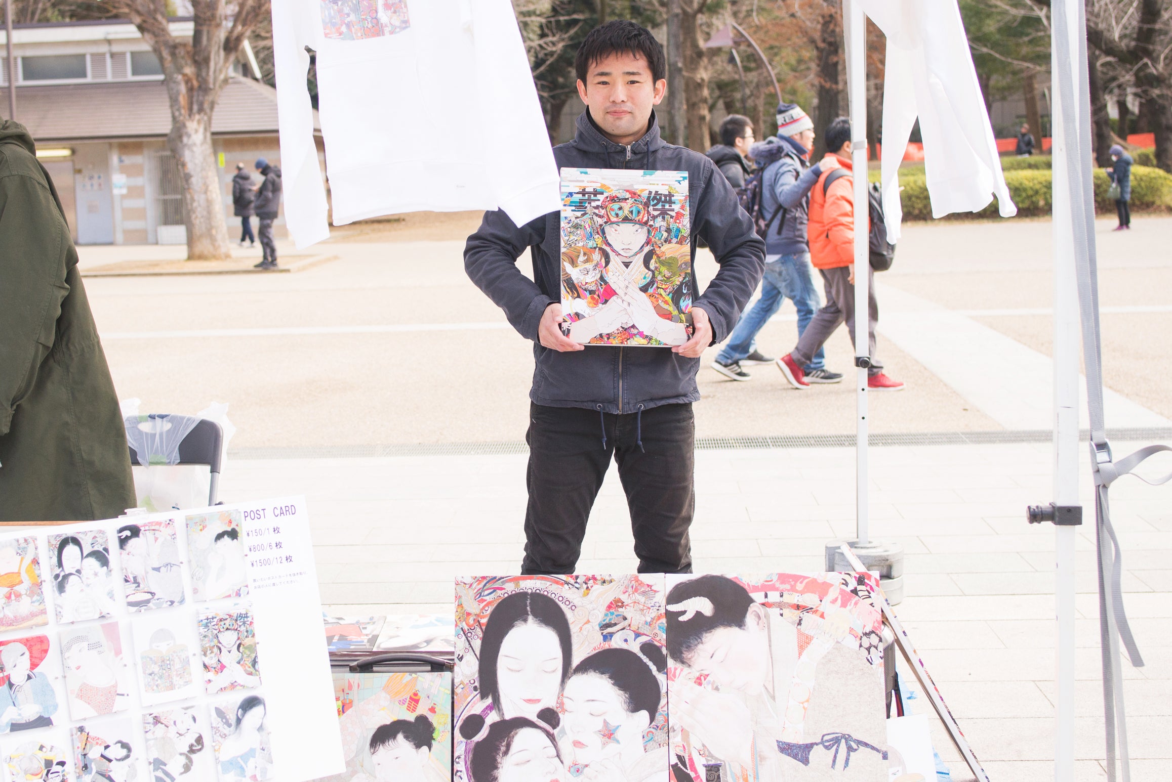 いつもコモゴモ展を開催している上野公園の広場では、たくさんの方に来てもらえるというメリットの反面、天候不良や突風の際には大変な苦労があります。