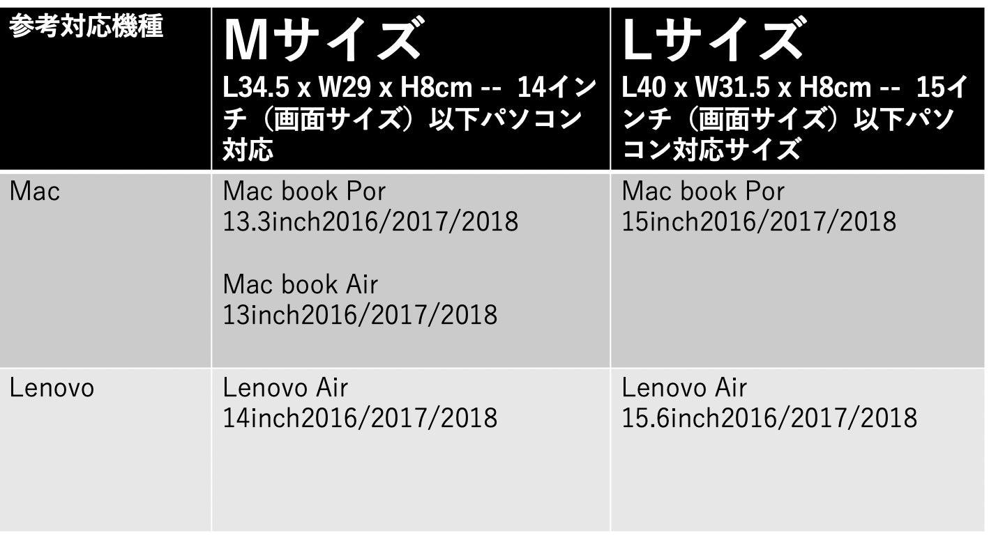 L :L40 x W31.5 x H8cm -- 15インチ(収納可能なノートPCの画面サイズ)
