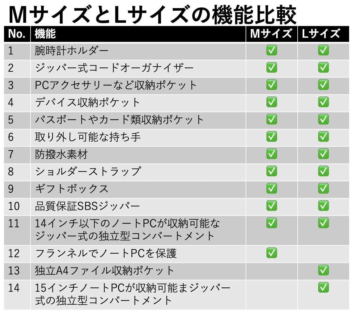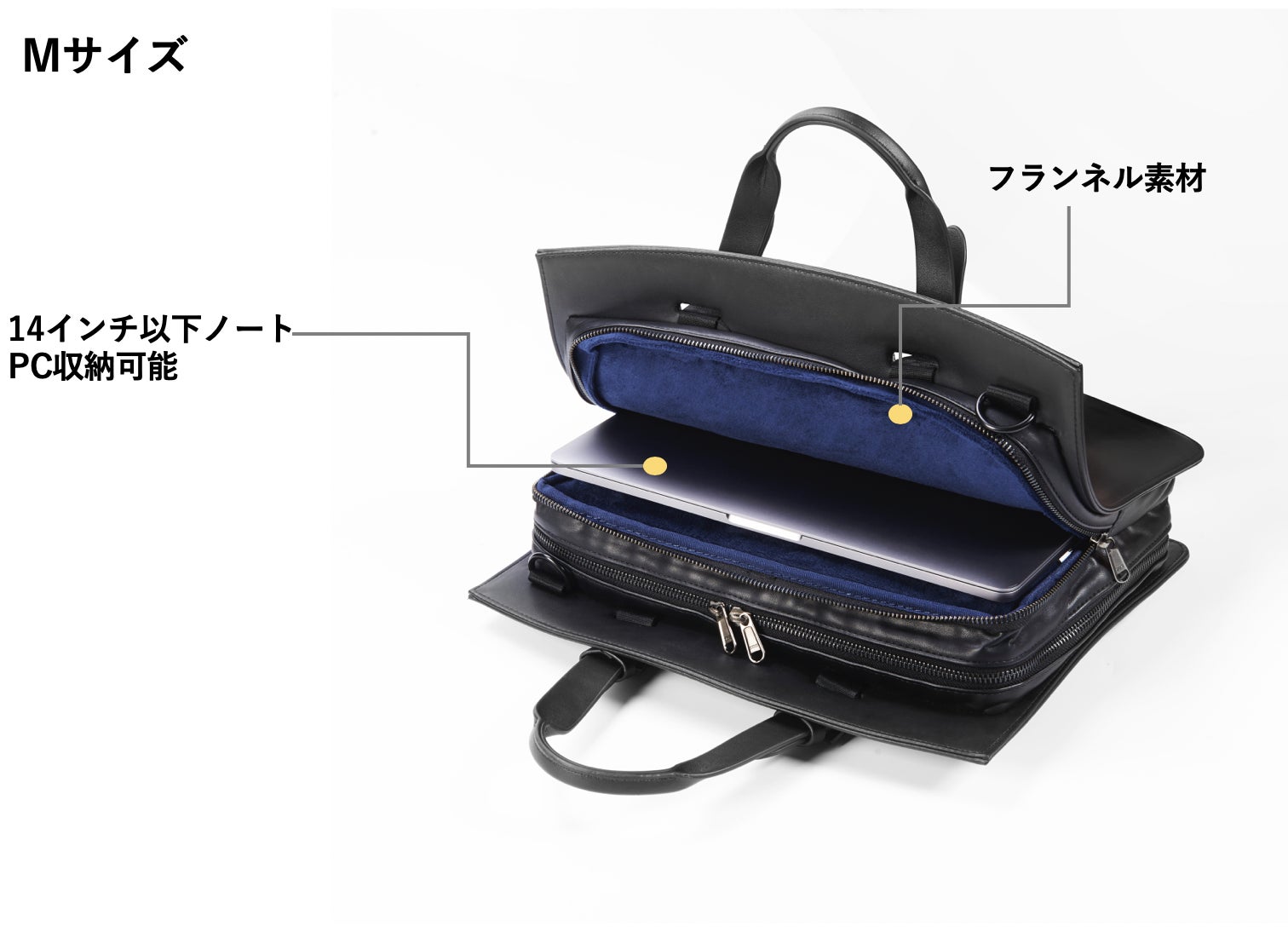 - Mサイズ:14インチ以下のノートPCを収納可能。PCの傷を防止するフランネル素材の独立型コンパートメント