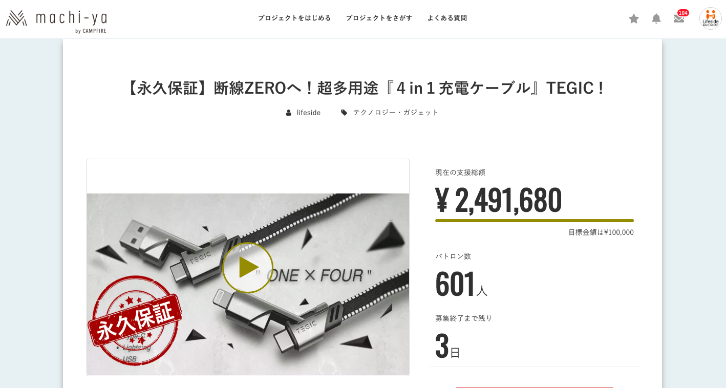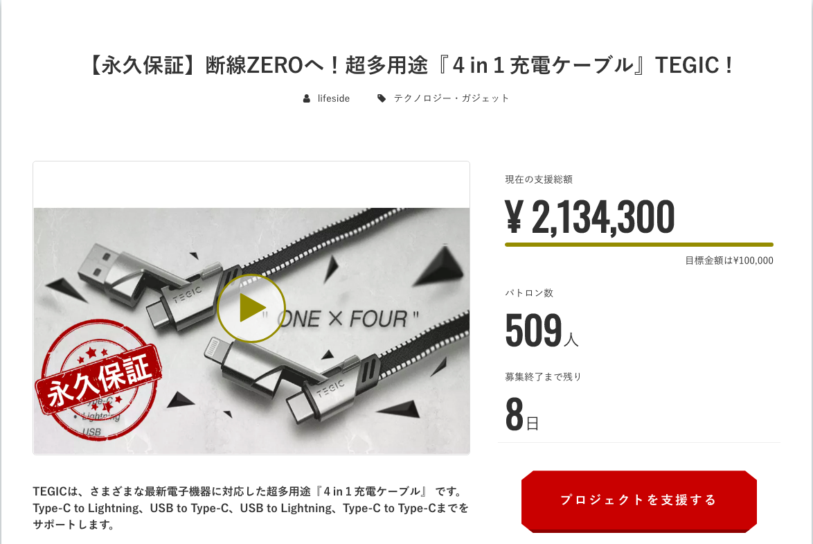 ご支援いただいたみなさまいつもお世話になります。【永久保証】断線ZEROへ!超多用途『4in1充電ケーブル』TEGIC !のご支援者数が500名を突破いたしました!これもひとえに、皆様方おひとりおひとりのご支援の賜物でございます。 厚く御礼申し上げます。さて、プロジェクトも残すところ8日となりました。引き続き、ご友人・お知り合いのみなさまに本プロジェクトについてシェアをしていただけますと幸いです。それでは、どうぞよろしくお願い致します。合同会社ライフサイド泉